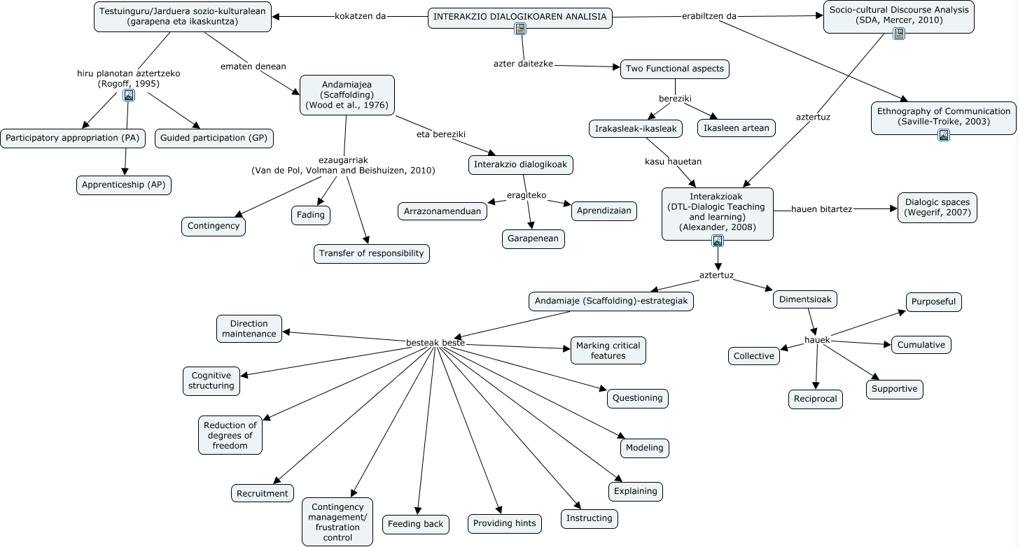 Este Cmap, tiene información relacionada con: Interakzio Dialogikoaren analisia gelan, INTERAKZIO DIALOGIKOAREN ANALISIA erabiltzen da Socio-cultural Discourse Analysis (SDA, Mercer, 2010), Interakzioak (DTL-Dialogic Teaching and learning) (Alexander, 2008) aztertuz Andamiaje (Scaffolding)-estrategiak, Andamiajea (Scaffolding) (Wood et al., 1976) ezaugarriak (Van de Pol, Volman and Beishuizen, 2010) Fading, INTERAKZIO DIALOGIKOAREN ANALISIA erabiltzen da Ethnography of Communication (Saville-Troike, 2003), Dimentsioak hauek Cumulative, Interakzioak (DTL-Dialogic Teaching and learning) (Alexander, 2008) hauen bitartez Dialogic spaces (Wegerif, 2007), Interakzio dialogikoak eragiteko Arrazonamenduan, Andamiaje (Scaffolding)-estrategiak besteak beste Cognitive structuring, Dimentsioak hauek Collective, Dimentsioak hauek Purposeful, Andamiaje (Scaffolding)-estrategiak besteak beste Reduction of degrees of freedom, Interakzioak (DTL-Dialogic Teaching and learning) (Alexander, 2008) aztertuz Dimentsioak, Andamiaje (Scaffolding)-estrategiak besteak beste Modeling, Andamiaje (Scaffolding)-estrategiak besteak beste Instructing, Andamiaje (Scaffolding)-estrategiak besteak beste Explaining, Andamiaje (Scaffolding)-estrategiak besteak beste Recruitment, INTERAKZIO DIALOGIKOAREN ANALISIA kokatzen da Testuinguru/Jarduera sozio-kulturalean (garapena eta ikaskuntza), Andamiaje (Scaffolding)-estrategiak besteak beste Contingency management/ frustration control, Andamiaje (Scaffolding)-estrategiak besteak beste Direction maintenance, Andamiaje (Scaffolding)-estrategiak besteak beste Questioning