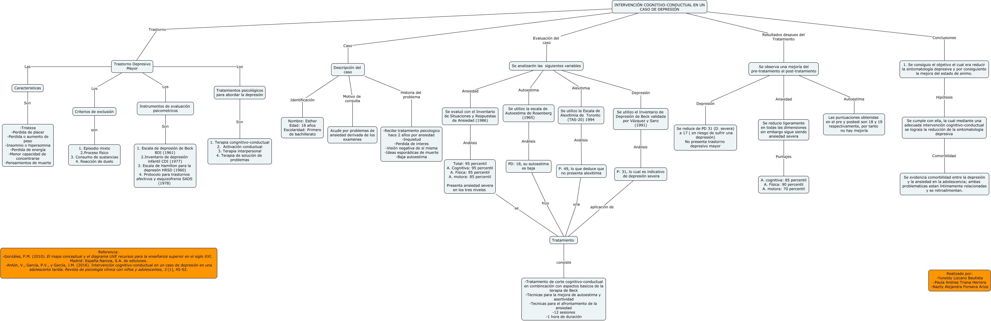 Este Cmap, tiene información relacionada con: ARTICULO 1, Descripción del caso Motivo de consulta Acude por problemas de ansiedad derivada de los examenes, INTERVENCIÓN COGNITIVO-CONDUCTUAL EN UN CASO DE DEPRESIÓN Conclusiones 1. Se consiguio el objetivo el cual era reducir la sintomatología depresiva y por consiguiente la mejora del estado de animo., Se cumple con ella, la cual mediante una adecuada intervención cognitivo-conductual se lograía la reducción de la sintomatología depresiva Comorbilidad Se evidencia comorbilidad entre la depresión y la ansiedad en la adolescencia; ambas problematicas estan íntimamente relacionadas y se retroalimentan., Trastorno Depresivo Mayor Los Tratamientos psicológicos para abordar la depresión, Descripción del caso Identificación Nombre: Esther Edad: 18 años Escolaridad: Primero de bachillerato, Total: 95 percentil A. Cognitiva: 95 percentil A. Física: 95 percentil A. motora: 85 percentil Presenta ansiedad severa en los tres niveles se Tratamiento, Se utilizo la escala de Autoestima de Rosenberg (1965) Análisis PD: 18, su autoestima es baja, Se analizarón las siguientes variables Autoestima Se utilizo la escala de Autoestima de Rosenberg (1965), Se analizarón las siguientes variables Alexitimia Se utilizo la Escala de Alexitimia de Toronto (TAS-20) 1994, Tratamiento consiste -Tratamiento de corte cognitivo-conductual en combincación con aspectos basicos de la terapia de Beck -Tecnicas para la mejora de autoestima y asertividad -Tecnicas para el afrontamiento de la ansiedad -12 sesiones -1 hora de duración, Trastorno Depresivo Mayor Los Instrumentos de evaluación psicometricos, Criterios de exclusión son 1. Episodio mixto 2.Proceso físico 3. Consumo de sustancias 4. Reacción de duelo, Se utilizo el Inventario de Depresión de Beck validada por Vázquez y Sanz (1991) Análisis P: 31, lo cual es indicativo de depresión severa, INTERVENCIÓN COGNITIVO-CONDUCTUAL EN UN CASO DE DEPRESIÓN Trastorno Trastorno Depresivo Mayor, Se utilizo la Escala de Alexitimia de Toronto (TAS-20) 1994 Análisis P: 49, lo que deduce que no presenta alexitimia, 1. Se consiguio el objetivo el cual era reducir la sintomatología depresiva y por consiguiente la mejora del estado de animo. Hipótesis Se cumple con ella, la cual mediante una adecuada intervención cognitivo-conductual se lograía la reducción de la sintomatología depresiva, Tratamientos psicológicos para abordar la depresión Son 1. Terapia congnitivo-conductual 2. Activación conductual 3. Terapia interpersonal 4. Terapia de solución de problemas, Se observa una mejoría del pre-tratamiento al post-tratamiento Ansiedad Se reducio ligeramente en todas las dimensiones sin embargo sigue siendo ansiedad severa, Se observa una mejoría del pre-tratamiento al post-tratamiento Depresión Se reduce de PD 31 (D. severa) a 17 ( en riesgo de sufrir una depresión) No presenta trastorno depresivo mayor, INTERVENCIÓN COGNITIVO-CONDUCTUAL EN UN CASO DE DEPRESIÓN Caso Descripción del caso