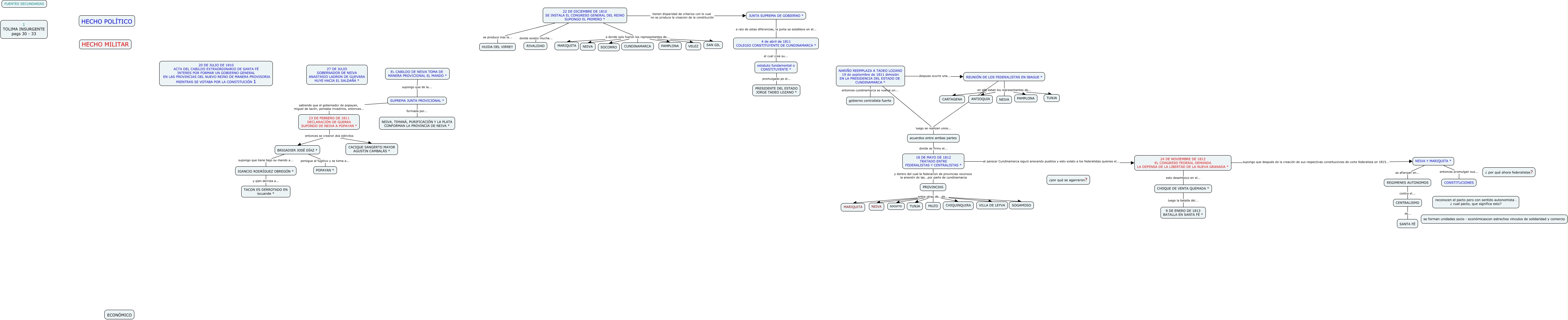 Este Cmap, tiene información relacionada con: TRATANDO DE JUNTAR HECHOS, REUNIÓN DE LOS FEDERALISTAS EN IBAGUE * luego se realizan unos... acuerdos entre ambas partes, estatuto fundamental o CONSTITUYENTE * promulgado po el... PRESIDENTE DEL ESTADO JORGE TADEO LOZANO *, PROVINCIAS entre otras de...de... NEIVA, EL CABILDO DE NEIVA TOMA DE MANERA PROVICIONAL EL MANDO * supongo que de la... SUPREMA JUNTA PROVICIONAL *, NEIVA Y MARIQUITA * entonces promulgan sus... CONSTITUCIONES, 23 DE FEBRERO DE 1811 DECLARACIÓN DE GUERRA SUPONDO DE NEIVA A POPAYAN * entonces se crearon dos ejércitos CACIQUE SANGERTO MAYOR AGUSTIN CAMBALÁS *, 22 DE DICIEMBRE DE 1810 SE INSTALA EL CONGRESO GENERAL DEL REINO SUPONGO EL PRIMERO * a donde solo fueron los representantes de... MARIQUITA, PROVINCIAS entre otras de...de... CHIQUINQUIRA, REUNIÓN DE LOS FEDERALISTAS EN IBAGUE * en ella estan los representantes de... TUNJA, 24 DE NOVIEMBRE DE 1812 EL CONGRESO FEDERAL DEMANDA LA DEFENSA DE LA LIBERTAD DE LA NUEVA GRANADA * supongo que después de la creación de sus respectivas constituciones de corte federalista en 1815... NEIVA Y MARIQUITA *, JUNTA SUPREMA DE GOBIERNO * a raiz de estas diferencias, la junta se establece en el... 4 de abril de 1811 COLEGIO CONSTITUYENTE DE CUNDINAMARCA *, 22 DE DICIEMBRE DE 1810 SE INSTALA EL CONGRESO GENERAL DEL REINO SUPONGO EL PRIMERO * a donde solo fueron los representantes de... PAMPLONA, 22 DE DICIEMBRE DE 1810 SE INSTALA EL CONGRESO GENERAL DEL REINO SUPONGO EL PRIMERO * a donde solo fueron los representantes de... CUNDINAMARCA, 23 DE FEBRERO DE 1811 DECLARACIÓN DE GUERRA SUPONDO DE NEIVA A POPAYAN * entonces se crearon dos ejércitos BRIGADIER JOSÉ DÍAZ *, REUNIÓN DE LOS FEDERALISTAS EN IBAGUE * en ella estan los representantes de... NEIVA, NARIÑO REEMPLAZA A TADEO LOZANO 19 de septiembre de 1811 dimisión EN LA PRESIDENCIA DEL ESTADO DE CUNDINAMARCA * entonces cundinamarca se vuelve un... gobierno centralista fuerte, REUNIÓN DE LOS FEDERALISTAS EN IBAGUE * en ella estan los representantes de... CARTAGENA, REUNIÓN DE LOS FEDERALISTAS EN IBAGUE * en ella estan los representantes de... ANTIOQUIA, NARIÑO REEMPLAZA A TADEO LOZANO 19 de septiembre de 1811 dimisión EN LA PRESIDENCIA DEL ESTADO DE CUNDINAMARCA * luego se realizan unos... acuerdos entre ambas partes, REUNIÓN DE LOS FEDERALISTAS EN IBAGUE * en ella estan los representantes de... PAMPLONA