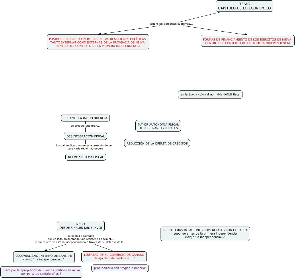 Este Cmap, tiene información relacionada con: tesis capítulo de lo económico, DESINTEGRACIÓN FISCAL lo cual implica o conyeva la creación de un... para cada región autonoma NUEVO SISTEMA FISCAL, TESIS CAPÍTULO DE LO ECONÓMICO tendra los siguientes subtemas... POSIBLES CAUSAS ECONÓMICAS DE LAS REACCIONES POLÍTICAS TANTO INTERNAS COMO EXTERNAS DE LA PROVINCIA DE NEIVA DENTRO DEL CONTEXTO DE LA PRIMERA INDEPENDENCIA, NEIVA DESDE FINALES DEL S. XVIII se oponía a SantaFé por un lado presentando una resistencia hacia el... y por el otro se estaba independizando a través de su defensa de la... LIBERTAD DE SU COMERCIO DE GANADO clavijo "la independencia ...", DURANTE LA INDEPENDENCIA se produjo una gran... DESINTEGRACIÓN FISCAL, NEIVA DESDE FINALES DEL S. XVIII se oponía a SantaFé por un lado presentando una resistencia hacia el... y por el otro se estaba independizando a través de su defensa de la... COLONIALISMO INTERNO DE SANTAFÉ clavijo " la independencia...", TESIS CAPÍTULO DE LO ECONÓMICO tendra los siguientes subtemas... FORMAS DE FINANCIAMIENTO DE LOS EJÉRCITOS DE NEIVA DENTRO DEL CONTEXTO DE LA PRIMERA INDEPENDENCIA