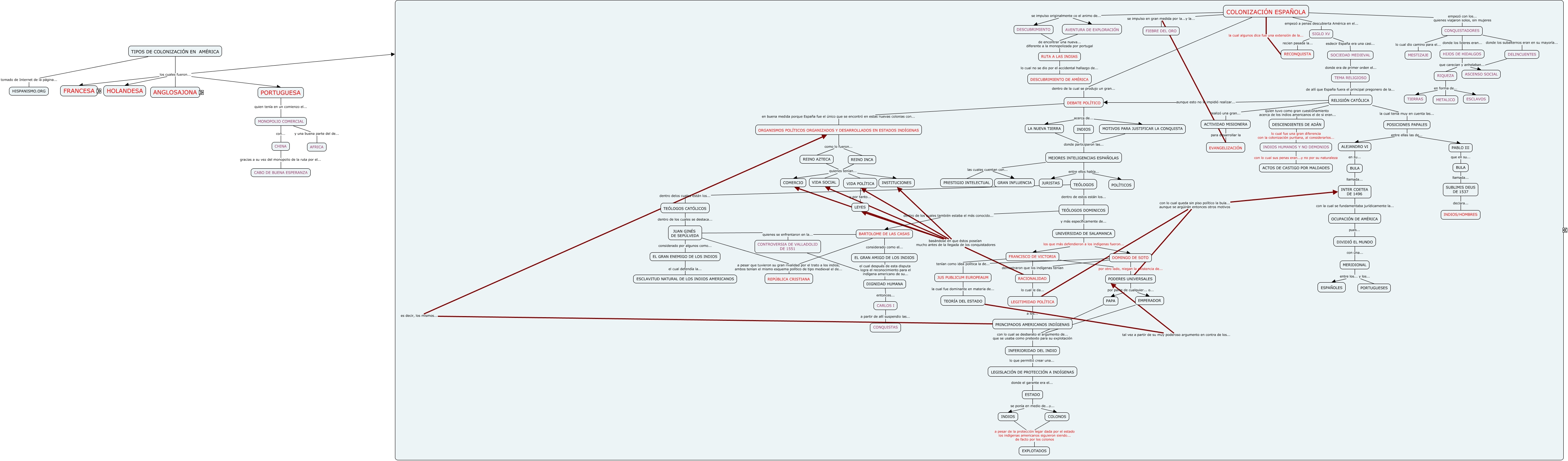 Este Cmap, tiene información relacionada con: TIPOS DE COLONIZACIÓN EN AMÉRICA, TEORÍA DEL ESTADO tal vez a partir de su muy poderoso argumento en contra de los... PODERES UNIVERSALES, COLONIZACIÓN FRANCESA no se presento mucho... MESTIZAJE, FE EN EL PROGRESO al igual que en... MUNDO BURGUÉS, DEBATE POLÍTICO en buena medida porque España fue el único que se encontró en estas nuevas colonias con... ORGANISMOS POLÍTICOS ORGANIZADOS Y DESARROLLADOS EN ESTADOS INDÍGENAS, DÉBIL el cual piensa en... PROBABILIDAD, REINO INCA quienes tenían... COMERCIO, DETERMINISMO el cual se base en... CAUSA - EFECTO, DOMINGO DE SOTO tenían como idea política la de... JUS PUBLICUM EUROPEAUM, COLONIZACIÓN FRANCESA al final desgraciada mente este tipo de colonización... DESAPARECIÓ, LA NUEVA TIERRA donde participaron las... MEJORES INTELIGENCIAS ESPAÑOLAS, AFRANCESADOS tanto por su... como por... CULTURA CLÁSICA Y LATINA, FRANCISCO DE VICTORIA demostraron que los indígenas tenían RACIONALIDAD, ESTILO DE VIDA AMERICANO principalmente en sus aspectos... PSICOLÓGICA, MERCANTILISMO FRANCÉS comerciando con... PIELES, MEJORES INTELIGENCIAS ESPAÑOLAS las cuales cuentan con... PRESTIGIO INTELECTUAL, COLONO FRANCÉS tenía... POCA POBLACIÓN, COLONOS a pesar de la protección legar dada por el estado los indígenas americanos siguieron siendo... de facto por los colonos EXPLOTADOS, COLONO FRANCÉS era de tipo... FEUDAL +-, FRANCISCO DE VICTORIA por otro lado, niegan la existencia de... PODERES UNIVERSALES, MEJORES INTELIGENCIAS ESPAÑOLAS entre ellos había... TEÓLOGOS