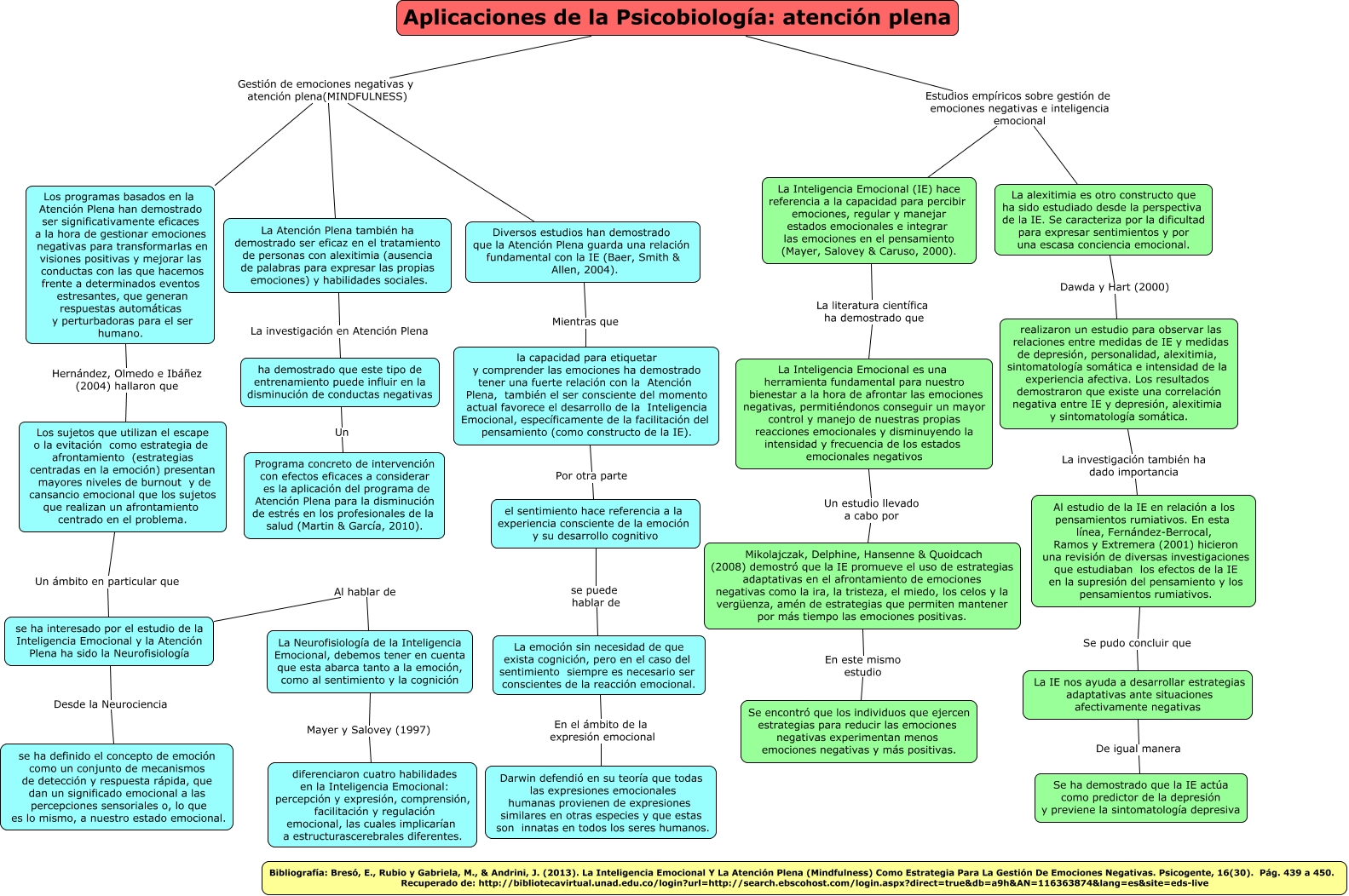 Este Cmap, tiene información relacionada con: Aplicaciones de la Psicobiología atención plena, Mikolajczak, Delphine, Hansenne & Quoidcach (2008) demostró que la IE promueve el uso de estrategias adaptativas en el afrontamiento de emociones negativas como la ira, la tristeza, el miedo, los celos y la vergüenza, amén de estrategias que permiten mantener por más tiempo las emociones positivas. En este mismo estudio Se encontró que los individuos que ejercen estrategias para reducir las emociones negativas experimentan menos emociones negativas y más positivas., Aplicaciones de la Psicobiología: atención plena Gestión de emociones negativas y atención plena(MINDFULNESS) Los programas basados en la Atención Plena han demostrado ser significativamente eficaces a la hora de gestionar emociones negativas para transformarlas en visiones positivas y mejorar las conductas con las que hacemos frente a determinados eventos estresantes, que generan respuestas automáticas y perturbadoras para el ser humano., el sentimiento hace referencia a la experiencia consciente de la emoción y su desarrollo cognitivo se puede hablar de La emoción sin necesidad de que exista cognición, pero en el caso del sentimiento siempre es necesario ser conscientes de la reacción emocional., Aplicaciones de la Psicobiología: atención plena Gestión de emociones negativas y atención plena(MINDFULNESS) La Atención Plena también ha demostrado ser eficaz en el tratamiento de personas con alexitimia (ausencia de palabras para expresar las propias emociones) y habilidades sociales., Aplicaciones de la Psicobiología: atención plena Estudios empíricos sobre gestión de emociones negativas e inteligencia emocional La alexitimia es otro constructo que ha sido estudiado desde la perspectiva de la IE. Se caracteriza por la dificultad para expresar sentimientos y por una escasa conciencia emocional., La Neurofisiología de la Inteligencia Emocional, debemos tener en cuenta que esta abarca tanto a la emoción, como al sentimiento y la cognición Mayer y Salovey (1997) diferenciaron cuatro habilidades en la Inteligencia Emocional: percepción y expresión, comprensión, facilitación y regulación emocional, las cuales implicarían a estructurascerebrales diferentes., La alexitimia es otro constructo que ha sido estudiado desde la perspectiva de la IE. Se caracteriza por la dificultad para expresar sentimientos y por una escasa conciencia emocional. Dawda y Hart (2000) realizaron un estudio para observar las relaciones entre medidas de IE y medidas de depresión, personalidad, alexitimia, sintomatología somática e intensidad de la experiencia afectiva. Los resultados demostraron que existe una correlación negativa entre IE y depresión, alexitimia y sintomatología somática., Los sujetos que utilizan el escape o la evitación como estrategia de afrontamiento (estrategias centradas en la emoción) presentan mayores niveles de burnout y de cansancio emocional que los sujetos que realizan un afrontamiento centrado en el problema. Un ámbito en particular que se ha interesado por el estudio de la Inteligencia Emocional y la Atención Plena ha sido la Neurofisiología, Aplicaciones de la Psicobiología: atención plena Estudios empíricos sobre gestión de emociones negativas e inteligencia emocional La Inteligencia Emocional (IE) hace referencia a la capacidad para percibir emociones, regular y manejar estados emocionales e integrar las emociones en el pensamiento (Mayer, Salovey & Caruso, 2000)., se ha interesado por el estudio de la Inteligencia Emocional y la Atención Plena ha sido la Neurofisiología Al hablar de La Neurofisiología de la Inteligencia Emocional, debemos tener en cuenta que esta abarca tanto a la emoción, como al sentimiento y la cognición, Diversos estudios han demostrado que la Atención Plena guarda una relación fundamental con la IE (Baer, Smith & Allen, 2004). Mientras que la capacidad para etiquetar y comprender las emociones ha demostrado tener una fuerte relación con la Atención Plena, también el ser consciente del momento actual favorece el desarrollo de la Inteligencia Emocional, específicamente de la facilitación del pensamiento (como constructo de la IE)., La Inteligencia Emocional (IE) hace referencia a la capacidad para percibir emociones, regular y manejar estados emocionales e integrar las emociones en el pensamiento (Mayer, Salovey & Caruso, 2000). La literatura científica ha demostrado que La Inteligencia Emocional es una herramienta fundamental para nuestro bienestar a la hora de afrontar las emociones negativas, permitiéndonos conseguir un mayor control y manejo de nuestras propias reacciones emocionales y disminuyendo la intensidad y frecuencia de los estados emocionales negativos, la capacidad para etiquetar y comprender las emociones ha demostrado tener una fuerte relación con la Atención Plena, también el ser consciente del momento actual favorece el desarrollo de la Inteligencia Emocional, específicamente de la facilitación del pensamiento (como constructo de la IE). Por otra parte el sentimiento hace referencia a la experiencia consciente de la emoción y su desarrollo cognitivo, Aplicaciones de la Psicobiología: atención plena Gestión de emociones negativas y atención plena(MINDFULNESS) Diversos estudios han demostrado que la Atención Plena guarda una relación fundamental con la IE (Baer, Smith & Allen, 2004)., se ha interesado por el estudio de la Inteligencia Emocional y la Atención Plena ha sido la Neurofisiología Desde la Neurociencia se ha definido el concepto de emoción como un conjunto de mecanismos de detección y respuesta rápida, que dan un significado emocional a las percepciones sensoriales o, lo que es lo mismo, a nuestro estado emocional., La emoción sin necesidad de que exista cognición, pero en el caso del sentimiento siempre es necesario ser conscientes de la reacción emocional. En el ámbito de la expresión emocional Dar