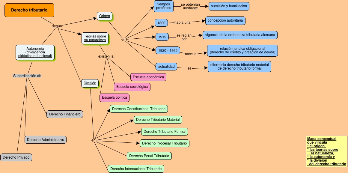 This Concept Map, created with IHMC CmapTools, has information related to: Derecho tributario, Autonomía (divergencia didáctica o funcional) Subordinación al: Derecho Financiero, División en Derecho Constitucional Tributario, Derecho tributario según División, División en Derecho Tributario Formal, Teorías sobre su naturaleza existen la: Escuela política, División en Derecho Internacional Tributario, Autonomía (divergencia didáctica o funcional) Subordinación al: Derecho Administrativo, Autonomía (divergencia didáctica o funcional) Subordinación al: Derecho Privado, Derecho tributario según Autonomía (divergencia didáctica o funcional), Origen en actualidad, 1920 - 1965 nace la relación jurídica obligacional (derecho de crédito y creación de deuda), Origen en 1919, actualidad se diferencia derecho tributario material de derecho tributario formal, 1919 se regían por vigencia de la ordenanza tributaria alemana, 1300 había una concepcion autoritaria, División en Derecho Procesal Tributario, tiempos pretéritos se obtenían mediante sumisión y humillación, Derecho tributario según Origen, Origen en 1300, Derecho tributario según Teorías sobre su naturaleza