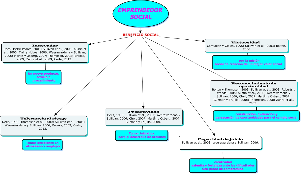 Este Cmap, tiene información relacionada con: emprendedor social II, BENEFICIO SOCIAL Capacidad de juicio Sullivan et al., 2003; Weerawardena y Sullivan, 2006., BENEFICIO SOCIAL Innovador Dees, 1998; Pearce, 2003; Sullivan et al., 2003; Austin et al., 2006; Mair y Noboa, 2006; Weerawardena y Sullivan, 2006; Martín y Osberg, 2007; Thompson, 2008; Brooks, 2009; Zahra et al., 2009; Curto, 2012., BENEFICIO SOCIAL Proactividad Dees, 1998; Sullivan et al., 2003; Weerawardena y Sullivan, 2006; Chell, 2007; Martín y Osberg, 2007; Guzmán y Trujillo, 2008., BENEFICIO SOCIAL Reconocimiento de oportunidad Bolton y Thompson, 2003; Sullivan et al., 2003; Roberts y Woods, 2005; Austin et al., 2006; Weerawardena y Sullivan, 2006; Chell, 2007; Martín y Osberg, 2007; Guzmán y Trujillo, 2008; Thompson, 2008; Zahra et al., 2009., BENEFICIO SOCIAL Tolerancia al riesgo Dees, 1998; Thompson et al., 2000; Sullivan et al., 2003; Weerawardena y Sullivan, 2006; Brooks, 2009; Curto, 2012., Capacidad de juicio Sullivan et al., 2003; Weerawardena y Sullivan, 2006. creatividad valentía y fortaleza ante las dificultades alto grado de compromiso, Virtuosidad Comunian y Gielen, 1995; Sullivan et al., 2003; Bolton, 2006 ???? por la misión social de creación de un mejor valor social, Proactividad Dees, 1998; Sullivan et al., 2003; Weerawardena y Sullivan, 2006; Chell, 2007; Martín y Osberg, 2007; Guzmán y Trujillo, 2008. ???? Tomar iniciativa para el desarrollo de acciones, Reconocimiento de oportunidad Bolton y Thompson, 2003; Sullivan et al., 2003; Roberts y Woods, 2005; Austin et al., 2006; Weerawardena y Sullivan, 2006; Chell, 2007; Martín y Osberg, 2007; Guzmán y Trujillo, 2008; Thompson, 2008; Zahra et al., 2009. ???? construcción, evaluación y persecución de oportunidades para el cambio social, BENEFICIO SOCIAL Virtuosidad Comunian y Gielen, 1995; Sullivan et al., 2003; Bolton, 2006, Tolerancia al riesgo Dees, 1998; Thompson et al., 2000; Sullivan et al., 2003; Weerawardena y Sullivan, 2006; Brooks, 2009; Curto, 2012. ???? Tomar deciciones en situaciones complejas, Innovador Dees, 1998; Pearce, 2003; Sullivan et al., 2003; Austin et al., 2006; Mair y Noboa, 2006; Weerawardena y Sullivan, 2006; Martín y Osberg, 2007; Thompson, 2008; Brooks, 2009; Zahra et al., 2009; Curto, 2012. ???? Un nuevo producto, sevicio o procedimiento