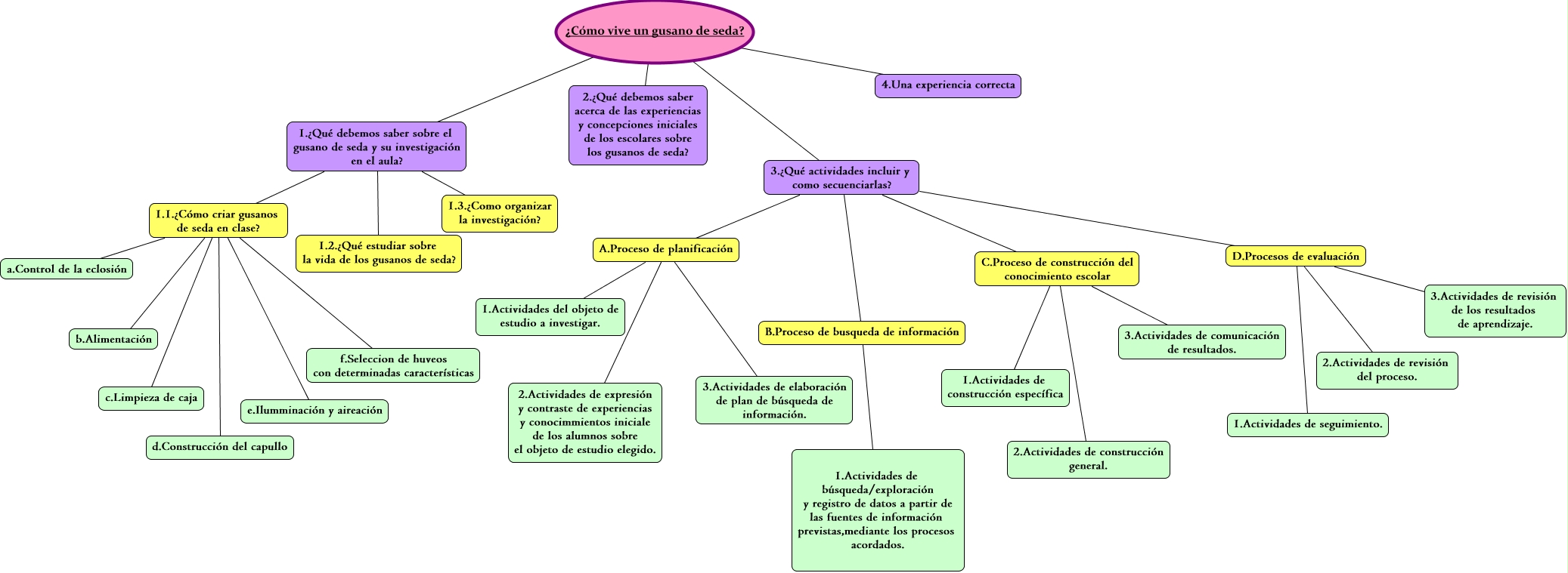 Este Cmap, tiene información relacionada con: gusanos, C.Proceso de construcción del conocimiento escolar 1.Actividades de construcción específica, A.Proceso de planificación 3.Actividades de elaboración de plan de búsqueda de información., C.Proceso de construcción del conocimiento escolar 3.Actividades de comunicación de resultados., ¿Cómo vive un gusano de seda? 3.¿Qué actividades incluir y como secuenciarlas?, D.Procesos de evaluación 1.Actividades de seguimiento., ¿Cómo vive un gusano de seda? 2.¿Qué debemos saber acerca de las experiencias y concepciones iniciales de los escolares sobre los gusanos de seda?, D.Procesos de evaluación 3.Actividades de revisión de los resultados de aprendizaje., ¿Cómo vive un gusano de seda? 4.Una experiencia correcta, D.Procesos de evaluación 2.Actividades de revisión del proceso., 1.¿Qué debemos saber sobre el gusano de seda y su investigación en el aula? 1.3.¿Como organizar la investigación?, 1.1.¿Cómo criar gusanos de seda en clase? e.Ilumminación y aireación, 3.¿Qué actividades incluir y como secuenciarlas? A.Proceso de planificación, A.Proceso de planificación 1.Actividades del objeto de estudio a investigar., 1.1.¿Cómo criar gusanos de seda en clase? b.Alimentación, C.Proceso de construcción del conocimiento escolar 2.Actividades de construcción general., 1.¿Qué debemos saber sobre el gusano de seda y su investigación en el aula? 1.2.¿Qué estudiar sobre la vida de los gusanos de seda?, 1.1.¿Cómo criar gusanos de seda en clase? a.Control de la eclosión, A.Proceso de planificación 2.Actividades de expresión y contraste de experiencias y conocimmientos iniciale de los alumnos sobre el objeto de estudio elegido., 1.1.¿Cómo criar gusanos de seda en clase? d.Construcción del capullo, 3.¿Qué actividades incluir y como secuenciarlas? D.Procesos de evaluación