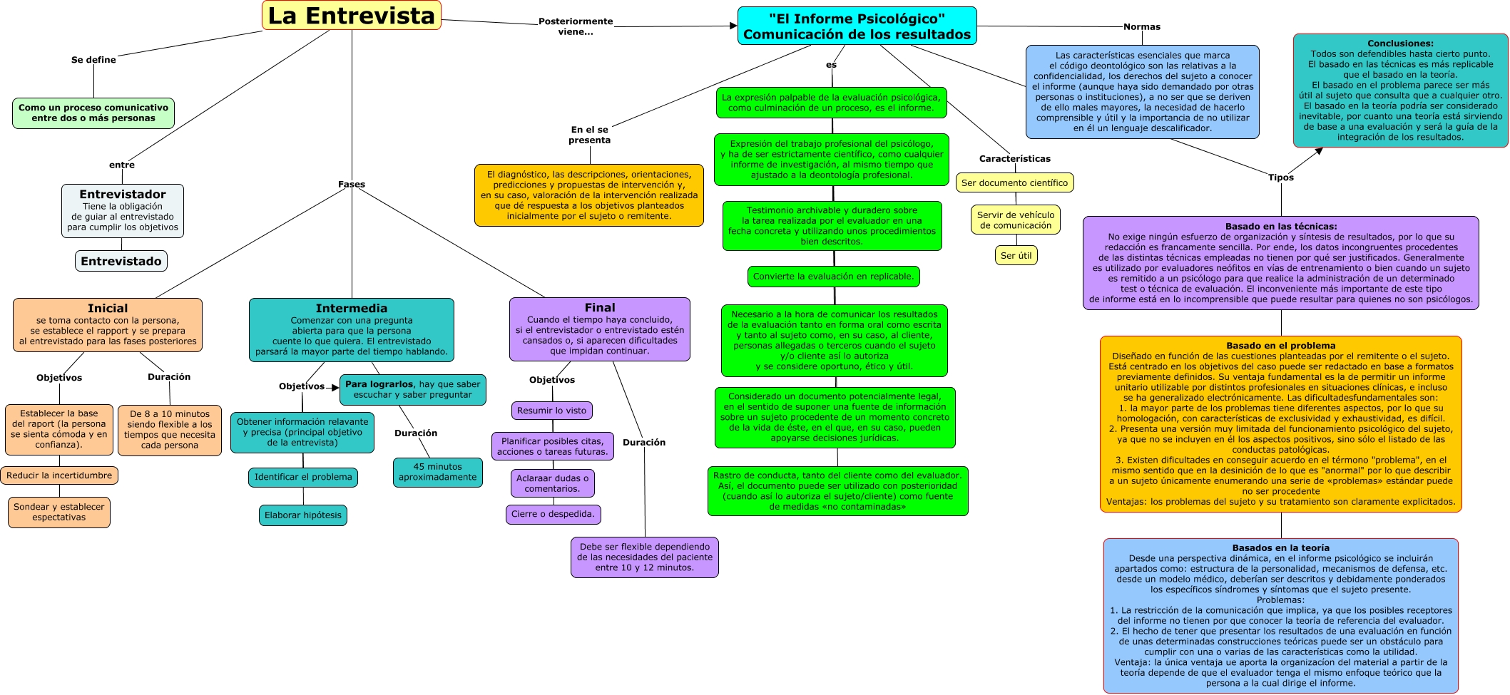 Este Cmap, tiene información relacionada con: La Entrevista, "El Informe Psicológico" Comunicación de los resultados En el se presenta El diagnóstico, las descripciones, orientaciones, predicciones y propuestas de intervención y, en su caso, valoración de la intervención realizada que dé respuesta a los objetivos planteados inicialmente por el sujeto o remitente., Intermedia Comenzar con una pregunta abierta para que la persona cuente lo que quiera. El entrevistado parsará la mayor parte del tiempo hablando. Objetivos Obtener información relavante y precisa (principal objetivo de la entrevista), Intermedia Comenzar con una pregunta abierta para que la persona cuente lo que quiera. El entrevistado parsará la mayor parte del tiempo hablando. Duración 45 minutos aproximadamente, "El Informe Psicológico" Comunicación de los resultados Características Servir de vehículo de comunicación, La Entrevista Fases Final Cuando el tiempo haya concluido, si el entrevistador o entrevistado estén cansados o, si aparecen dificultades que impidan continuar., "El Informe Psicológico" Comunicación de los resultados Normas Las características esenciales que marca el código deontológico son las relativas a la confidencialidad, los derechos del sujeto a conocer el informe (aunque haya sido demandado por otras personas o instituciones), a no ser que se deriven de ello males mayores, la necesidad de hacerlo comprensible y útil y la importancia de no utilizar en él un lenguaje descalificador., Final Cuando el tiempo haya concluido, si el entrevistador o entrevistado estén cansados o, si aparecen dificultades que impidan continuar. Duración Debe ser flexible dependiendo de las necesidades del paciente entre 10 y 12 minutos., "El Informe Psicológico" Comunicación de los resultados Tipos Basado en el problema Diseñado en función de las cuestiones planteadas por el remitente o el sujeto. Está centrado en los objetivos del caso puede ser redactado en base a formatos previamente definidos. Su ventaja fundamental es la de permitir un informe unitario utilizable por distintos profesionales en situaciones clínicas, e incluso se ha generalizado electrónicamente. Las dificultadesfundamentales son: 1. la mayor parte de los problemas tiene diferentes aspectos, por lo que su homologación, con características de exclusividad y exhaustividad, es difícil. 2. Presenta una versión muy limitada del funcionamiento psicológico del sujeto, ya que no se incluyen en él los aspectos positivos, sino sólo el listado de las conductas patológicas. 3. Existen dificultades en conseguir acuerdo en el térmono "problema", en el mismo sentido que en la desinición de lo que es "anormal" por lo que describir a un sujeto únicamente enumerando una serie de «problemas» estándar puede no ser procedente Ventajas: los problemas del sujeto y su tratamiento son claramente explicitados., La Entrevista entre Entrevistado, "El Informe Psicológico" Comunicación de los resultados es Necesario a la hora de comunicar los resultados de la evaluación tanto en forma oral como escrita y tanto al sujeto como, en su caso, al cliente, personas allegadas o terceros cuando el sujeto y/o cliente así lo autoriza y se considere oportuno, ético y útil., "El Informe Psicológico" Comunicación de los resultados es Rastro de conducta, tanto del cliente como del evaluador. Así, el documento puede ser utilizado con posterioridad (cuando así lo autoriza el sujeto/cliente) como fuente de medidas «no contaminadas», La Entrevista Fases Intermedia Comenzar con una pregunta abierta para que la persona cuente lo que quiera. El entrevistado parsará la mayor parte del tiempo hablando., "El Informe Psicológico" Comunicación de los resultados Tipos Basados en la teoría Desde una perspectiva dinámica, en el informe psicológico se incluirán apartados como: estructura de la personalidad, mecanismos de defensa, etc. desde un modelo médico, deberían ser descritos y debidamente ponderados los específicos síndromes y síntomas que el sujeto presente. Problemas: 1. La restricción de la comunicación que implica, ya que los posibles receptores del informe no tienen por que conocer la teoría de referencia del evaluador. 2. El hecho de tener que presentar los resultados de una evaluación en función de unas determinadas construcciones teóricas puede ser un obstáculo para cumplir con una o varias de las características como la utilidad. Ventaja: la única ventaja ue aporta la organizacíon del material a partir de la teoría depende de que el evaluador tenga el mismo enfoque teórico que la persona a la cual dirige el informe., Final Cuando el tiempo haya concluido, si el entrevistador o entrevistado estén cansados o, si aparecen dificultades que impidan continuar. Objetivos Planificar posibles citas, acciones o tareas futuras., La Entrevista entre Entrevistador Tiene la obligación de guiar al entrevistado para cumplir los objetivos, "El Informe Psicológico" Comunicación de los resultados Características Ser documento científico, Final Cuando el tiempo haya concluido, si el entrevistador o entrevistado estén cansados o, si aparecen dificultades que impidan continuar. Objetivos Aclaraar dudas o comentarios., "El Informe Psicológico" Comunicación de los resultados Características Ser útil, Inicial se toma contacto con la persona, se establece el rapport y se prepara al entrevistado para las fases posteriores Duración De 8 a 10 minutos siendo flexible a los tiempos que necesita cada persona, Intermedia Comenzar con una pregunta abierta para que la persona cuente lo que quiera. El entrevistado parsará la mayor parte del tiempo hablando. Objetivos Identificar el problema