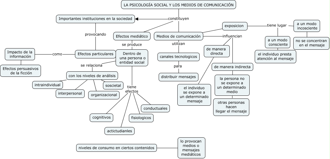 Este Cmap, tiene información relacionada con: psicologia social y los medios de comunicación, de manera indirecta ???? la persona no se expone a un determinado medio, LA PSICOLOGÍA SOCIAL Y LOS MEDIOS DE COMUNICACIÓN constituyen Medios de comunicación, Dentro de una persona o entidad social tiene efectos conductuales, Medios de comunicación influencian de manera directa, Efectos mediático se produce Dentro de una persona o entidad social, canales tecnologicos para distribuir mensajes, con los niveles de análisis ???? intraindividual, Dentro de una persona o entidad social se relaciona con los niveles de análisis, con los niveles de análisis ???? interpersonal, a un modo incosciente ???? no se concentran en el mensaje, Medios de comunicación ???? exposicion, a un modo consciente ???? el individuo presta atención al mensaje, Dentro de una persona o entidad social tiene efectos fisiologicos, de manera directa ???? el individuo se expone a un determinado mensaje, con los niveles de análisis ???? organizacional, LA PSICOLOGÍA SOCIAL Y LOS MEDIOS DE COMUNICACIÓN constituyen Importantes instituciones en la sociedad, exposicion tiene lugar a un modo incosciente, niveles de consumo en ciertos contenidos ???? lo provocan medios o mensajes mediáticos, LA PSICOLOGÍA SOCIAL Y LOS MEDIOS DE COMUNICACIÓN constituyen Efectos mediático, Importantes instituciones en la sociedad provocando Efectos particulares