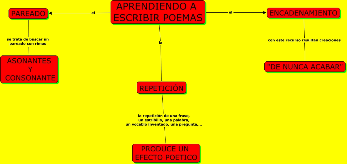 Este Cmap, tiene información relacionada con: APRENDIENDO A ESCRIBIR POEMAS 1, PAREADO se trata de buscar un pareado con rimas ASONANTES Y CONSONANTE, APRENDIENDO A ESCRIBIR POEMAS el PAREADO, REPETICIÓN la repetición de una frase, un estribillo, una palabra, un vocablo inventado, una pregunta,... PRODUCE UN EFECTO POETICO, ENCADENAMIENTO con este recurso resultan creaciones "DE NUNCA ACABAR", APRENDIENDO A ESCRIBIR POEMAS el ENCADENAMIENTO, APRENDIENDO A ESCRIBIR POEMAS la REPETICIÓN