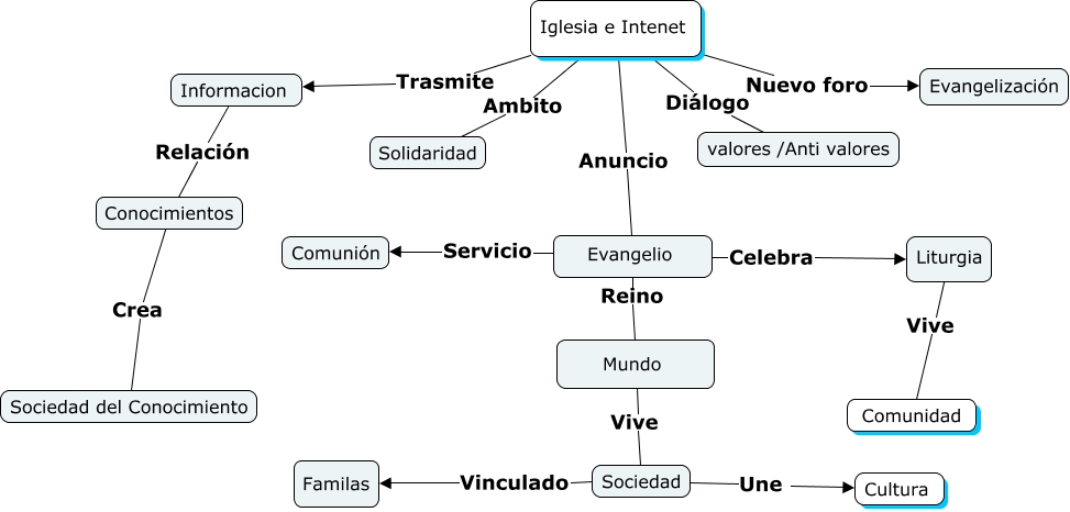 Este Cmap, tiene información relacionada con: IGLESIA E INTERNET, Evangelio Reino Mundo, Iglesia e Intenet Anuncio Evangelio, Evangelio Servicio Comunión, Iglesia e Intenet Nuevo foro Evangelización, Mundo Vive Sociedad, Iglesia e Intenet Trasmite Informacion, Iglesia e Intenet Diálogo valores /Anti valores, Sociedad Vinculado Familas, Iglesia e Intenet Ambito Solidaridad, Informacion Relación Conocimientos, Liturgia Vive Comunidad, Sociedad Une Cultura, Evangelio Celebra Liturgia, Conocimientos Crea Sociedad del Conocimiento