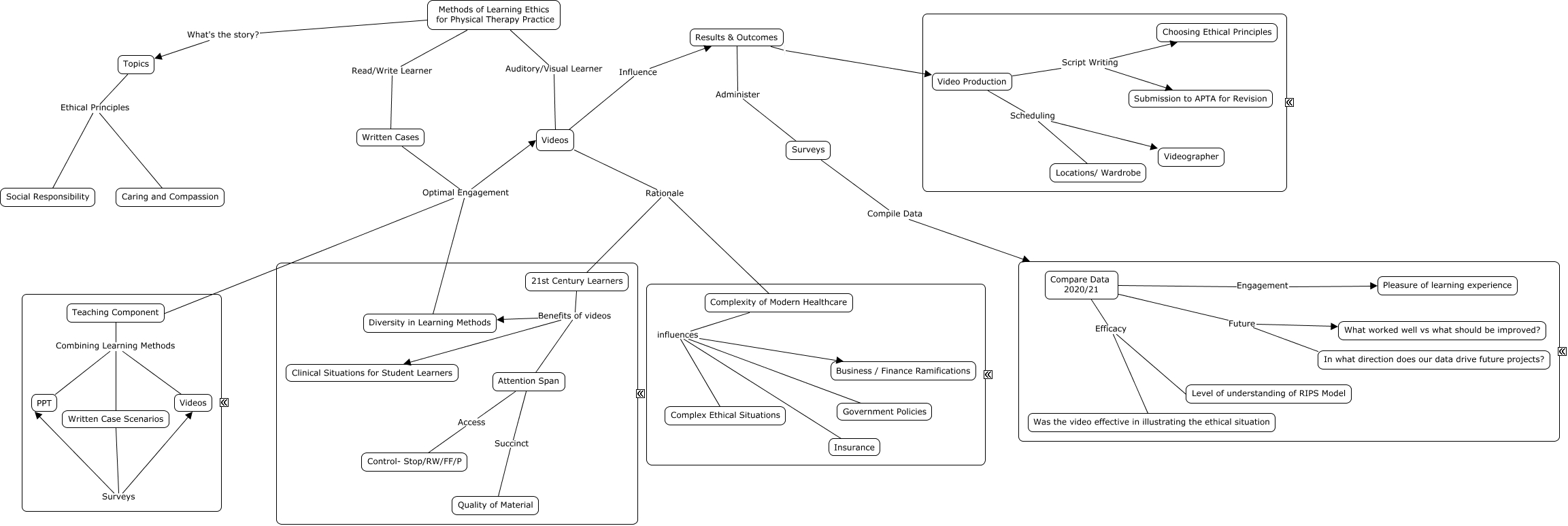 This Concept Map, created with IHMC CmapTools, has information related to: Ethics CMAP.cmap, Videos Rationale 21st Century Learners, Results & Outcomes Administer Surveys, Written Case Scenarios Surveys Videos, Compare Data 2020/21 Future In what direction does our data drive future projects?, Teaching Component Combining Learning Methods Written Case Scenarios, Complexity of Modern Healthcare influences Insurance, Written Case Scenarios Surveys PPT, Compare Data 2020/21 Efficacy Level of understanding of RIPS Model, Written Cases Optimal Engagement Teaching Component, Compare Data 2020/21 Efficacy Was the video effective in illustrating the ethical situation, Attention Span Succinct Quality of Material, Complexity of Modern Healthcare influences Business / Finance Ramifications, Attention Span Access Control- Stop/RW/FF/P, Complexity of Modern Healthcare influences Government Policies, Video Production Scheduling Videographer, 21st Century Learners Benefits of videos Attention Span, Diversity in Learning Methods Optimal Engagement Teaching Component, Videos Rationale Complexity of Modern Healthcare, Methods of Learning Ethics for Physical Therapy Practice Auditory/Visual Learner Videos, Compare Data 2020/21 Engagement Pleasure of learning experience