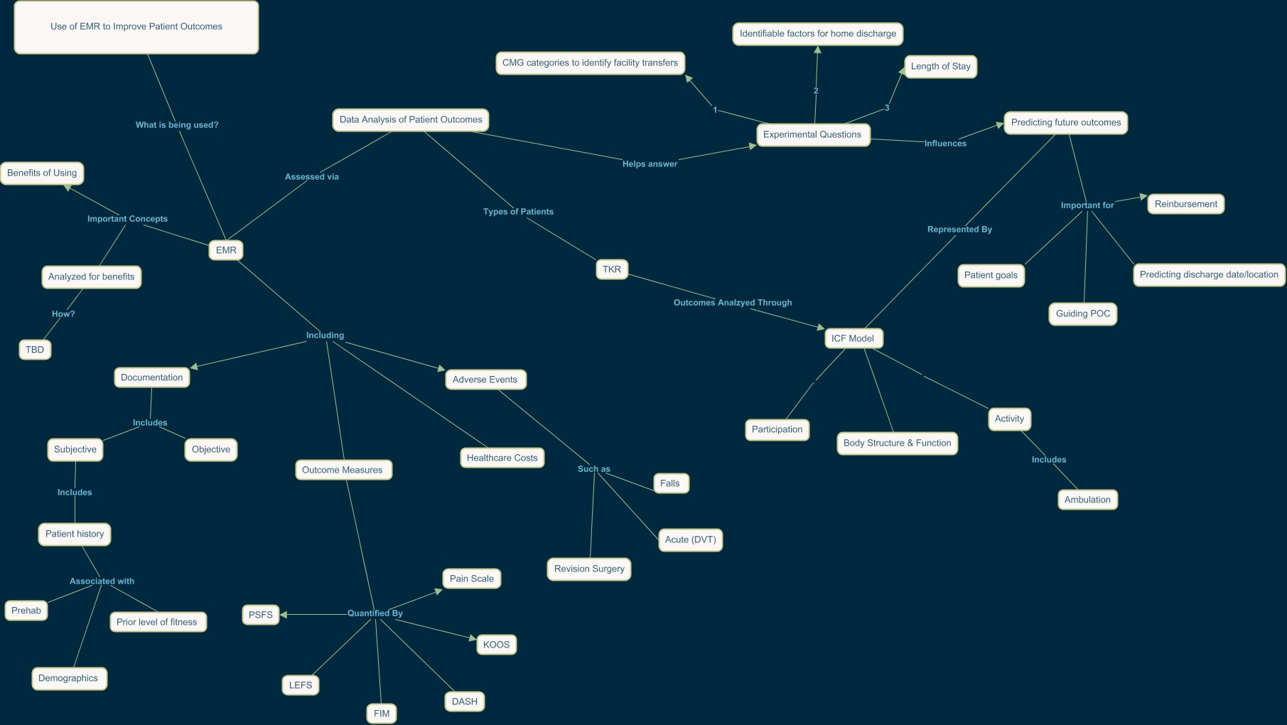 This Concept Map, created with IHMC CmapTools, has information related to: Burke EMR Data Analysis Project with Dr. Herbold.cmap, Predicting future outcomes Represented By ICF Model, Data Analysis of Patient Outcomes Assessed via EMR, Data Analysis of Patient Outcomes Helps answer Experimental Questions, Predicting future outcomes Important for Predicting discharge date/location, ICF Model Participation, Experimental Questions 2 Identifiable factors for home discharge, Experimental Questions 3 Length of Stay, Documentation Includes Subjective, Subjective Includes Patient history, Activity Includes Ambulation, Patient history Associated with Prior level of fitness, EMR Including Outcome Measures, Documentation Includes Objective, TKR Outcomes Analzyed Through ICF Model, Outcome Measures Quantified By LEFS, Outcome Measures Quantified By PSFS, Analyzed for benefits How? TBD, EMR Including Adverse Events, Patient history Associated with Demographics, Adverse Events Such as Revision Surgery