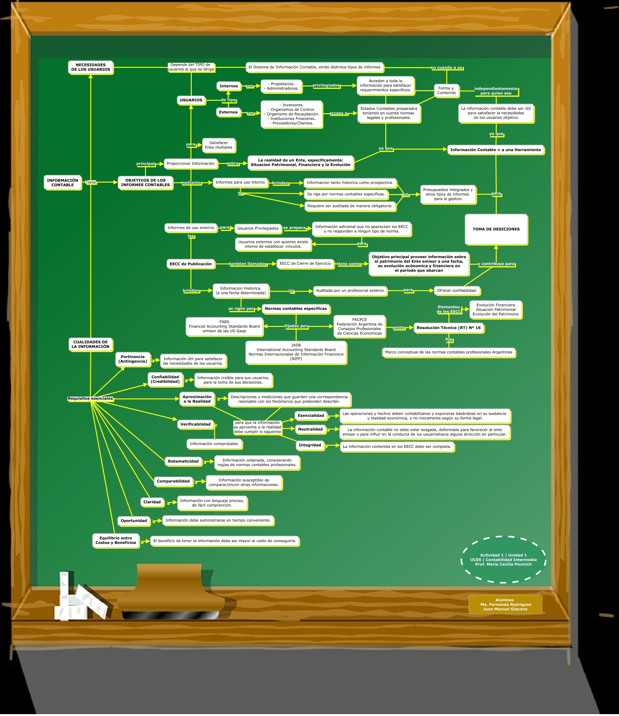 Este Cmap, tiene información relacionada con: Contabilidad Intermedia - Actividad 1, Proporcionar Información mediante Informes para uso interno, EECC de Publicación tambien llamados EECC de Cierre de Ejercicio, Proporcionar Información para USUARIOS, Integridad : La información contenida en los EECC debe ser completa., USUARIOS de tipo Internos, NECESIDADES DE LOS USUARIOS Depende del TIPO de usuarios al que se dirige USUARIOS, Forma y Contenido independientemente para quien sea La información contable debe ser útil para satisfacer la necesidades de los usuarios objetivo, Internos son - Propietarios. - Administradores., Normas contables especificas fijadas por IASB International Accounting Standards Board Normas Internacionales de Información Financiera (NIFF), Proporcionar Información mediante Informes de uso externo, CUALIDADES DE LA INFORMACIÓN Requisitos esenciales Confiabilidad (Credibilidad), - Inversores. - Organismos de Control. - Organismo de Recaudación. - Instituciones Finacieras. - Proveedores/Clientes. acceso a Estados Contables preparados teniendo en cuenta normas legales y profesionales., INFORMACIÓN CONTABLE Tiene OBJETIVOS DE LOS INFORMES CONTABLES, FACPCE Federación Argentina de Consejos Profesionales de Ciencias Economicas emite Resolución Técnica (RT) Nº 16, Informacion tanto historica como prospectiva. son Presupuestos integrados y otros tipos de informes para la gestion, - Propietarios. - Administradores. privilegiados Acceden a toda la información para satisfacer requerimientos especificos., Resolución Técnica (RT) Nº 16 fija Marco conceptual de las normas contables profesionales Argentinas, Descripciones y mediciones que guarden una correspondencia razonable con los fenómenos que pretenden describir. para que la información se aproxime a la realidad debe cumplir lo siguiente Integridad, Informes para uso interno brindan Informacion tanto historica como prospectiva., Descripciones y mediciones que guarden una correspondencia razonable con los fenómenos que pretenden describir. para que la información se aproxime a la realidad debe cumplir lo siguiente Esencialidad