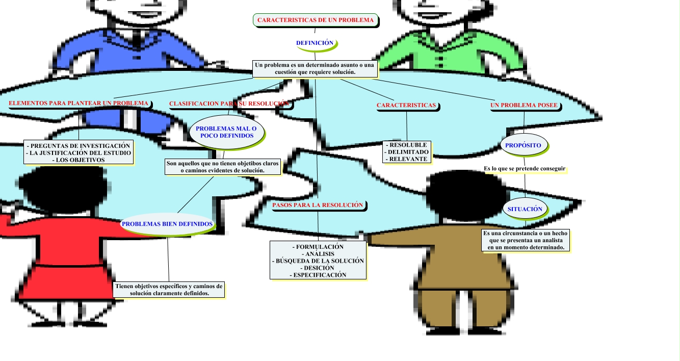Este Cmap, tiene información relacionada con: CARACTERISTICAS DE UN PROBLEMA, Un problema es un determinado asunto o una cuestión que requiere solución. CARACTERISTICAS - RESOLUBLE - DELIMITADO - RELEVANTE, PROPÓSITO Es lo que se pretende conseguir Es una circunstancia o un hecho que se presentaa un analista en un momento determinado., Un problema es un determinado asunto o una cuestión que requiere solución. PASOS PARA LA RESOLUCIÓN - FORMULACIÓN - ANÁLISIS - BÚSQUEDA DE LA SOLUCIÓN - DESICIÓN - ESPECIFICACIÓN, CARACTERISTICAS DE UN PROBLEMA DEFINICIÓN Un problema es un determinado asunto o una cuestión que requiere solución., Un problema es un determinado asunto o una cuestión que requiere solución. UN PROBLEMA POSEE PROPÓSITO, Un problema es un determinado asunto o una cuestión que requiere solución. ELEMENTOS PARA PLANTEAR UN PROBLEMA - PREGUNTAS DE INVESTIGACIÓN - LA JUSTIFICACIÓN DEL ESTUDIO - LOS OBJETIVOS, PROBLEMAS MAL O POCO DEFINIDOS ???? Son aquellos que no tienen objetibos claros o caminos evidentes de solución., Son aquellos que no tienen objetibos claros o caminos evidentes de solución. PROBLEMAS BIEN DEFINIDOS Tienen objetivos específicos y caminos de solución claramente definidos., Un problema es un determinado asunto o una cuestión que requiere solución. CLASIFICACION PARA SU RESOLUCIÓN PROBLEMAS MAL O POCO DEFINIDOS
