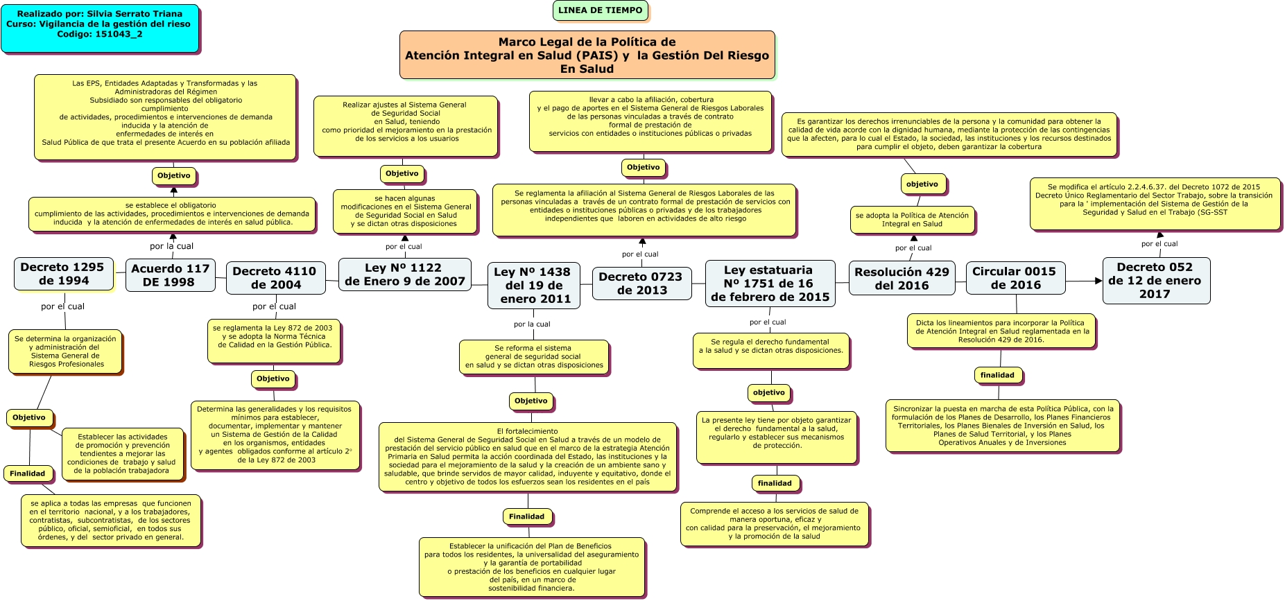 Este Cmap, tiene información relacionada con: linea del tiempo, Se reglamenta la afiliación al Sistema General de Riesgos Laborales de las personas vinculadas a través de un contrato formal de prestación de servicios con entidades o instituciones públicas o privadas y de los trabajadores independientes que laboren en actividades de alto riesgo ???? Objetivo, se hacen algunas modificaciones en el Sistema General de Seguridad Social en Salud y se dictan otras disposiciones ???? Objetivo, La presente ley tiene por objeto garantizar el derecho fundamental a la salud, regularlo y establecer sus mecanismos de protección. ???? finalidad, Decreto 0723 de 2013 por el cual Se reglamenta la afiliación al Sistema General de Riesgos Laborales de las personas vinculadas a través de un contrato formal de prestación de servicios con entidades o instituciones públicas o privadas y de los trabajadores independientes que laboren en actividades de alto riesgo, Objetivo ???? Las EPS, Entidades Adaptadas y Transformadas y las Administradoras del Régimen Subsidiado son responsables del obligatorio cumplimiento de actividades, procedimientos e intervenciones de demanda inducida y la atención de enfermedades de interés en Salud Pública de que trata el presente Acuerdo en su población afiliada, El fortalecimiento del Sistema General de Seguridad Social en Salud a través de un modelo de prestación del servicio público en salud que en el marco de la estrategia Atención Primaria en Salud permita la acción coordinada del Estado, las instituciones y la sociedad para el mejoramiento de la salud y la creación de un ambiente sano y saludable, que brinde servidos de mayor calidad, induyente y equitativo, donde el centro y objetivo de todos los esfuerzos sean los residentes en el país ???? Finalidad, Finalidad ???? se aplica a todas las empresas que funcionen en el territorio nacional, y a los trabajadores, contratistas, subcontratistas, de los sectores público, oficial, semioficial, en todos sus órdenes, y del sector privado en general., Objetivo ???? Establecer las actividades de promoción y prevención tendientes a mejorar las condiciones de trabajo y salud de la población trabajadora, se adopta la Política de Atención Integral en Salud ???? objetivo, Decreto 052 de 12 de enero 2017 por el cual Se modifica el artículo 2.2.4.6.37. del Decreto 1072 de 2015 Decreto Único Reglamentario del Sector Trabajo, sobre la transición para la ' implementación del Sistema de Gestión de la Seguridad y Salud en el Trabajo (SG-SST, Objetivo ???? El fortalecimiento del Sistema General de Seguridad Social en Salud a través de un modelo de prestación del servicio público en salud que en el marco de la estrategia Atención Primaria en Salud permita la acción coordinada del Estado, las instituciones y la sociedad para el mejoramiento de la salud y la creación de un ambiente sano y saludable, que brinde servidos de mayor calidad, induyente y equitativo, donde el centro y objetivo de todos los esfuerzos sean los residentes en el país, Circular 0015 de 2016 ???? Dicta los lineamientos para incorporar la Política de Atención Integral en Salud reglamentada en la Resolución 429 de 2016., Acuerdo 117 DE 1998 ???? Decreto 4110 de 2004, Se reforma el sistema general de seguridad social en salud y se dictan otras disposiciones ???? Objetivo, Decreto 1295 de 1994 por el cual Se determina la organización y administración del Sistema General de Riesgos Profesionales, Decreto 4110 de 2004 por el cual se reglamenta la Ley 872 de 2003 y se adopta la Norma Técnica de Calidad en la Gestión Pública., Finalidad ???? Establecer la unificación del Plan de Beneficios para todos los residentes, la universalidad del aseguramiento y la garantía de portabilidad o prestación de los beneficios en cualquier lugar del país, en un marco de sostenibilidad financiera., Objetivo ???? llevar a cabo la afiliación, cobertura y el pago de aportes en el Sistema General de Riesgos Laborales de las personas vinculadas a través de contrato formal de prestación de servicios con entidades o instituciones públicas o privadas, se reglamenta la Ley 872 de 2003 y se adopta la Norma Técnica de Calidad en la Gestión Pública. ???? Objetivo, Decreto 1295 de 1994 ???? Acuerdo 117 DE 1998