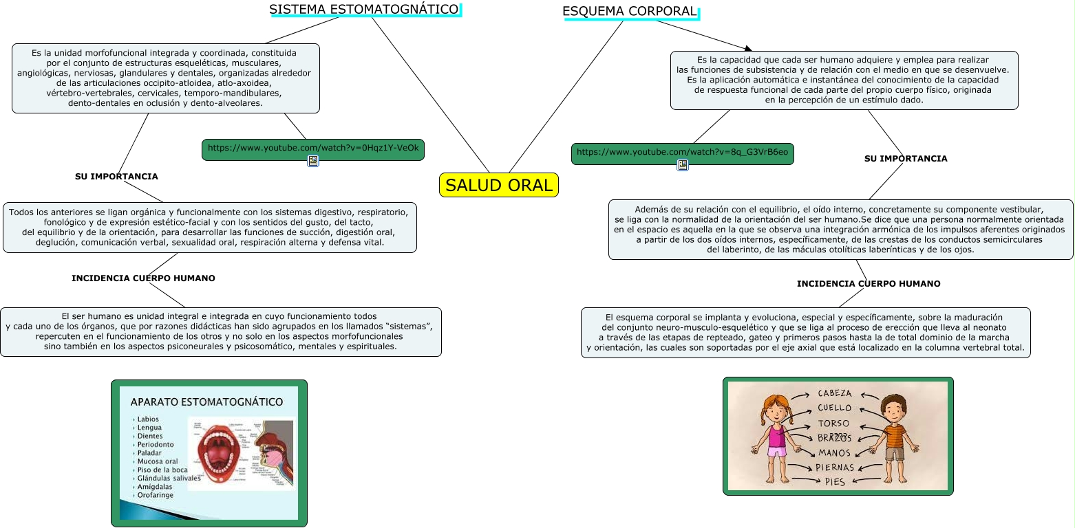 Este Cmap, tiene información relacionada con: SALUD ORAL, Todos los anteriores se ligan orgánica y funcionalmente con los sistemas digestivo, respiratorio, fonológico y de expresión estético-facial y con los sentidos del gusto, del tacto, del equilibrio y de la orientación, para desarrollar las funciones de succión, digestión oral, deglución, comunicación verbal, sexualidad oral, respiración alterna y defensa vital. INCIDENCIA CUERPO HUMANO El ser humano es unidad integral e integrada en cuyo funcionamiento todos y cada uno de los órganos, que por razones didácticas han sido agrupados en los llamados “sistemas”, repercuten en el funcionamiento de los otros y no solo en los aspectos morfofuncionales sino también en los aspectos psiconeurales y psicosomático, mentales y espirituales., Es la unidad morfofuncional integrada y coordinada, constituida por el conjunto de estructuras esqueléticas, musculares, angiológicas, nerviosas, glandulares y dentales, organizadas alrededor de las articulaciones occipito-atloidea, atlo-axoidea, vértebro-vertebrales, cervicales, temporo-mandibulares, dento-dentales en oclusión y dento-alveolares. SU IMPORTANCIA Todos los anteriores se ligan orgánica y funcionalmente con los sistemas digestivo, respiratorio, fonológico y de expresión estético-facial y con los sentidos del gusto, del tacto, del equilibrio y de la orientación, para desarrollar las funciones de succión, digestión oral, deglución, comunicación verbal, sexualidad oral, respiración alterna y defensa vital., Además de su relación con el equilibrio, el oído interno, concretamente su componente vestibular, se liga con la normalidad de la orientación del ser humano.Se dice que una persona normalmente orientada en el espacio es aquella en la que se observa una integración armónica de los impulsos aferentes originados a partir de los dos oídos internos, específicamente, de las crestas de los conductos semicirculares del laberinto, de las máculas otolíticas laberínticas y de los ojos. INCIDENCIA CUERPO HUMANO El esquema corporal se implanta y evoluciona, especial y específicamente, sobre la maduración del conjunto neuro-musculo-esquelético y que se liga al proceso de erección que lleva al neonato a través de las etapas de repteado, gateo y primeros pasos hasta la de total dominio de la marcha y orientación, las cuales son soportadas por el eje axial que está localizado en la columna vertebral total., SALUD ORAL SISTEMA ESTOMATOGNÁTICO Es la unidad morfofuncional integrada y coordinada, constituida por el conjunto de estructuras esqueléticas, musculares, angiológicas, nerviosas, glandulares y dentales, organizadas alrededor de las articulaciones occipito-atloidea, atlo-axoidea, vértebro-vertebrales, cervicales, temporo-mandibulares, dento-dentales en oclusión y dento-alveolares., SALUD ORAL ESQUEMA CORPORAL Es la capacidad que cada ser humano adquiere y emplea para realizar las funciones de subsistencia y de relación con el medio en que se desenvuelve. Es la aplicación automática e instantánea del conocimiento de la capacidad de respuesta funcional de cada parte del propio cuerpo físico, originada en la percepción de un estímulo dado., Es la capacidad que cada ser humano adquiere y emplea para realizar las funciones de subsistencia y de relación con el medio en que se desenvuelve. Es la aplicación automática e instantánea del conocimiento de la capacidad de respuesta funcional de cada parte del propio cuerpo físico, originada en la percepción de un estímulo dado. SU IMPORTANCIA Además de su relación con el equilibrio, el oído interno, concretamente su componente vestibular, se liga con la normalidad de la orientación del ser humano.Se dice que una persona normalmente orientada en el espacio es aquella en la que se observa una integración armónica de los impulsos aferentes originados a partir de los dos oídos internos, específicamente, de las crestas de los conductos semicirculares del laberinto, de las máculas otolíticas laberínticas y de los ojos., Es la capacidad que cada ser humano adquiere y emplea para realizar las funciones de subsistencia y de relación con el medio en que se desenvuelve. Es la aplicación automática e instantánea del conocimiento de la capacidad de respuesta funcional de cada parte del propio cuerpo físico, originada en la percepción de un estímulo dado. ???? https://www.youtube.com/watch?v=8q_G3VrB6eo, Es la unidad morfofuncional integrada y coordinada, constituida por el conjunto de estructuras esqueléticas, musculares, angiológicas, nerviosas, glandulares y dentales, organizadas alrededor de las articulaciones occipito-atloidea, atlo-axoidea, vértebro-vertebrales, cervicales, temporo-mandibulares, dento-dentales en oclusión y dento-alveolares. ???? https://www.youtube.com/watch?v=0Hqz1Y-VeOk