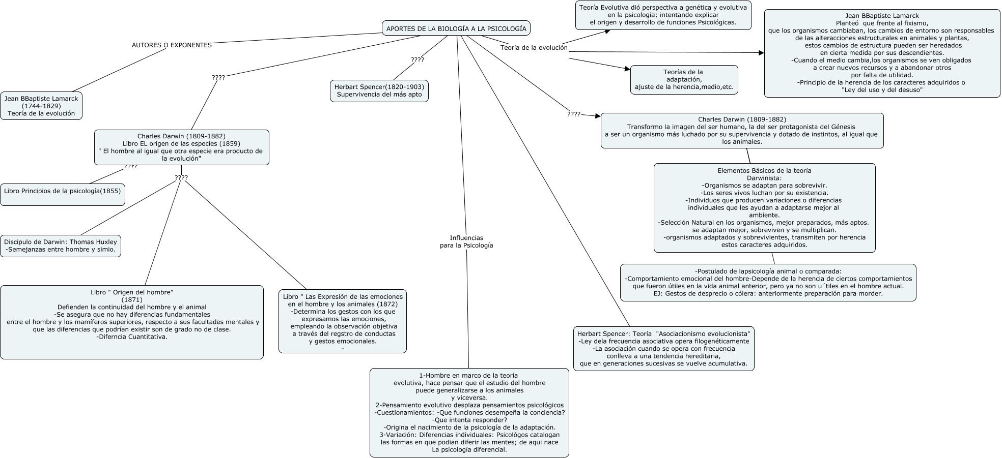 Este Cmap, tiene información relacionada con: BIOOLOGIA A LA PSICOLOGIA, Charles Darwin (1809-1882) Transformo la imagen del ser humano, la del ser protagonista del Génesis a ser un organismo más luchado por su supervivencia y dotado de instintos, al igual que los animales. ???? -Postulado de lapsicología animal o comparada: -Comportamiento emocional del hombre-Depende de la herencia de ciertos comportamientos que fueron útiles en la vida animal anterior, pero ya no son u´tiles en el hombre actual. EJ: Gestos de desprecio o cólera: anteriormente preparación para morder., APORTES DE LA BIOLOGÍA A LA PSICOLOGÍA Teoría de la evolución Teoría Evolutiva dió perspectiva a genética y evolutiva en la psicología; intentando explicar el origen y desarrollo de funciones Psicológicas., Charles Darwin (1809-1882) Libro EL origen de las especies (1859) " El hombre al igual que otra especie era producto de la evolución" ???? Libro Principios de la psicología(1855), APORTES DE LA BIOLOGÍA A LA PSICOLOGÍA Teoría de la evolución Teorías de la adaptación, ajuste de la herencia,medio,etc., APORTES DE LA BIOLOGÍA A LA PSICOLOGÍA Teoría de la evolución Jean BBaptiste Lamarck Planteó que frente al fixismo, que los organismos cambiaban, los cambios de entorno son responsables de las alteracciones estructurales en animales y plantas, estos cambios de estructura pueden ser heredados en cierta medida por sus descendientes. -Cuando el medio cambia,los organismos se ven obligados a crear nuevos recursos y a abandonar otros por falta de utilidad. -Principio de la herencia de los caracteres adquiridos o "Ley del uso y del desuso", APORTES DE LA BIOLOGÍA A LA PSICOLOGÍA Influencias para la Psicología 1-Hombre en marco de la teoría evolutiva, hace pensar que el estudio del hombre puede generalizarse a los animales y viceversa. 2-Pensamiento evolutivo desplaza pensamientos psicológicos -Cuestionamientos: -Que funciones desempeña la conciencia? -Que intenta responder? -Origina el nacimiento de la psicología de la adaptación. 3-Variación: Diferencias individuales: Psicológos catalogan las formas en que podian diferir las mentes; de aqui nace La psicología diferencial., APORTES DE LA BIOLOGÍA A LA PSICOLOGÍA ???? Herbart Spencer(1820-1903) Supervivencia del más apto, Charles Darwin (1809-1882) Libro EL origen de las especies (1859) " El hombre al igual que otra especie era producto de la evolución" ???? Libro " Origen del hombre" (1871) Defienden la continuidad del hombre y el animal -Se asegura que no hay diferencias fundamentales entre el hombre y los mamíferos superiores, respecto a sus facultades mentales y que las diferencias que podrían existir son de grado no de clase. -Diferncia Cuantitativa., APORTES DE LA BIOLOGÍA A LA PSICOLOGÍA ???? Charles Darwin (1809-1882) Transformo la imagen del ser humano, la del ser protagonista del Génesis a ser un organismo más luchado por su supervivencia y dotado de instintos, al igual que los animales., APORTES DE LA BIOLOGÍA A LA PSICOLOGÍA AUTORES O EXPONENTES Jean BBaptiste Lamarck (1744-1829) Teoría de la evolución, Charles Darwin (1809-1882) Transformo la imagen del ser humano, la del ser protagonista del Génesis a ser un organismo más luchado por su supervivencia y dotado de instintos, al igual que los animales. ???? Elementos Básicos de la teoría Darwinista: -Organismos se adaptan para sobrevivir. -Los seres vivos luchan por su existencia. -Individuos que producen variaciones o diferencias individuales que les ayudan a adaptarse mejor al ambiente. -Selección Natural en los organismos, mejor preparados, más aptos. se adaptan mejor, sobreviven y se multiplican. -organismos adaptados y sobrevivientes, transmiten por herencia estos caracteres adquiridos., Charles Darwin (1809-1882) Libro EL origen de las especies (1859) " El hombre al igual que otra especie era producto de la evolución" ???? Discipulo de Darwin: Thomas Huxley -Semejanzas entre hombre y simio., APORTES DE LA BIOLOGÍA A LA PSICOLOGÍA ???? Herbart Spencer: Teoría "Asociacionismo evolucionista" -Ley dela frecuencia asociativa opera filogenéticamente -La asociación cuando se opera con frecuencia conlleva a una tendencia hereditaria, que en generaciones sucesivas se vuelve acumulativa., Charles Darwin (1809-1882) Libro EL origen de las especies (1859) " El hombre al igual que otra especie era producto de la evolución" ???? Libro " Las Expresión de las emociones en el hombre y los animales (1872) -Determina los gestos con los que expresamos las emociones, empleando la observación objetiva a través del regstro de conductas y gestos emocionales. -, APORTES DE LA BIOLOGÍA A LA PSICOLOGÍA ???? Charles Darwin (1809-1882) Libro EL origen de las especies (1859) " El hombre al igual que otra especie era producto de la evolución"
