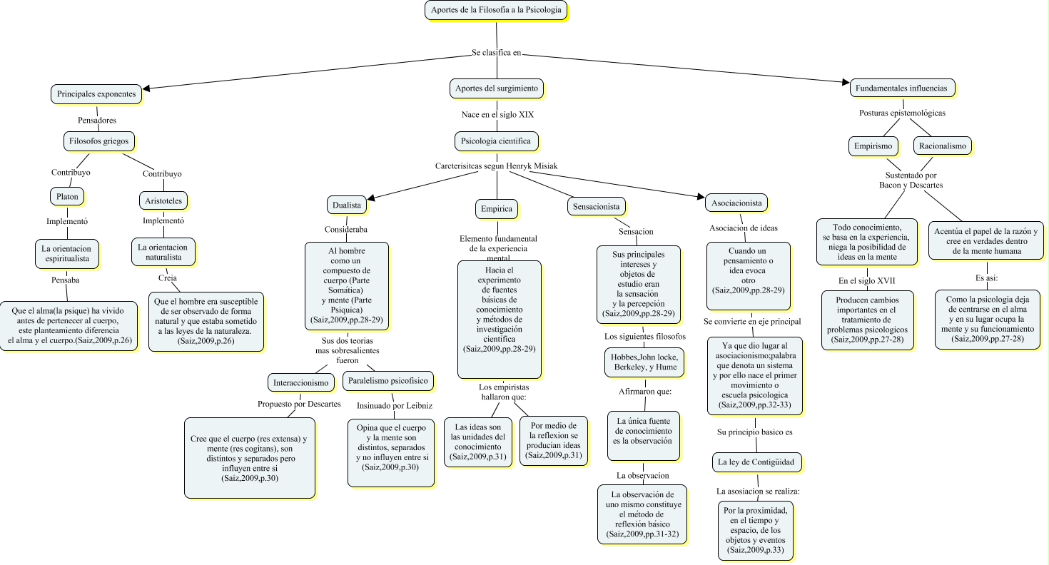 Este Cmap, tiene información relacionada con: Mapa Conceptual Aportes de la Filosofia a la Psicologia, Racionalismo Sustentado por Bacon y Descartes Todo conocimiento, se basa en la experiencia, niega la posibilidad de ideas en la mente, Hobbes,John locke, Berkeley, y Hume Afirmaron que: La única fuente de conocimiento es la observación, Hacia el experimento de fuentes básicas de conocimiento y métodos de investigación científica (Saiz,2009,pp.28-29) Los empiristas hallaron que: Por medio de la reflexion se producian ideas (Saiz,2009,p.31), La orientacion naturalista Creia Que el hombre era susceptible de ser observado de forma natural y que estaba sometido a las leyes de la naturaleza. (Saiz,2009,p.26), Fundamentales influencias Posturas epistemológicas Racionalismo, Interaccionismo Propuesto por Descartes Cree que el cuerpo (res extensa) y mente (res cogitans), son distintos y separados pero influyen entre si (Saiz,2009,p.30), Aristoteles Implementó La orientacion naturalista, Racionalismo Sustentado por Bacon y Descartes Acentúa el papel de la razón y cree en verdades dentro de la mente humana, Empirica Elemento fundamental de la experiencia mental Hacia el experimento de fuentes básicas de conocimiento y métodos de investigación científica (Saiz,2009,pp.28-29), Hacia el experimento de fuentes básicas de conocimiento y métodos de investigación científica (Saiz,2009,pp.28-29) Los empiristas hallaron que: Las ideas son las unidades del conocimiento (Saiz,2009,p.31), Todo conocimiento, se basa en la experiencia, niega la posibilidad de ideas en la mente En el siglo XVII Producen cambios importantes en el tratamiento de problemas psicologicos (Saiz,2009,pp.27-28), Psicologia cientifica Carcterisitcas segun Henryk Misiak Sensacionista, Empirismo Sustentado por Bacon y Descartes Todo conocimiento, se basa en la experiencia, niega la posibilidad de ideas en la mente, Platon Implementó La orientacion espiritualista, Acentúa el papel de la razón y cree en verdades dentro de la mente humana Es asi: Como la psicologia deja de centrarse en el alma y en su lugar ocupa la mente y su funcionamiento (Saiz,2009,pp.27-28), Filosofos griegos Contribuyo Aristoteles, Al hombre como un compuesto de cuerpo (Parte Somática) y mente (Parte Psiquica) (Saiz,2009,pp.28-29) Sus dos teorias mas sobresalientes fueron Paralelismo psicofisico, Aportes del surgimiento Nace en el siglo XIX Psicologia cientifica, Al hombre como un compuesto de cuerpo (Parte Somática) y mente (Parte Psiquica) (Saiz,2009,pp.28-29) Sus dos teorias mas sobresalientes fueron Interaccionismo, Empirismo Sustentado por Bacon y Descartes Acentúa el papel de la razón y cree en verdades dentro de la mente humana