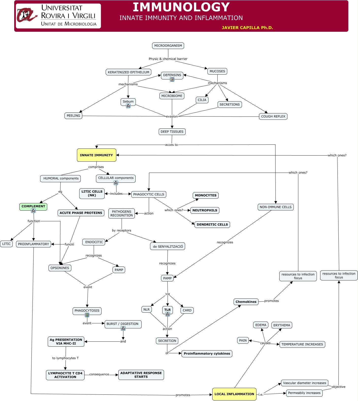 Aquest mapa conceptual conté informació relacionada amb: START INNATE, PHAGOCYTOSIS event BURST / DIGESTION, LYMPHOCYTE T CD4 ACTIVATION consequence ADAPTATIVE RESPONSE STARTS, LOCAL INFLAMMATION causes EDEMA, Vascular diameter increases objective resources to infection focus, MUCOSES mechanisms COUGH REFLEX, HUMORAL components eg ACUTE PHASE PROTEINS, PHAGOCYTIC CELLS which ones? NEUTROPHILS, SECRETION of Chemokines, INNATE IMMUNITY comprises CELLULAR components, ACUTE PHASE PROTEINS funció OPSONINES, MUCOSES mechanisms DEFENSINS, ACUTE PHASE PROTEINS funció PROINFLAMMATORY, KERATINIZED EPITHELIUM mechanisms PEELING, PHAGOCYTIC CELLS which ones? MONOCYTES, Ag PRESENTATION VIA MHC-II to lymphocytes T LYMPHOCYTE T CD4 ACTIVATION, PAMP via CARD, HUMORAL components comprises CELLULAR components, PAMP event PHAGOCYTOSIS, SECRETIONS evasion DEEP TISSUES, PATHOGENS RECOGNITION by receptors de SENYALITZACIÓ