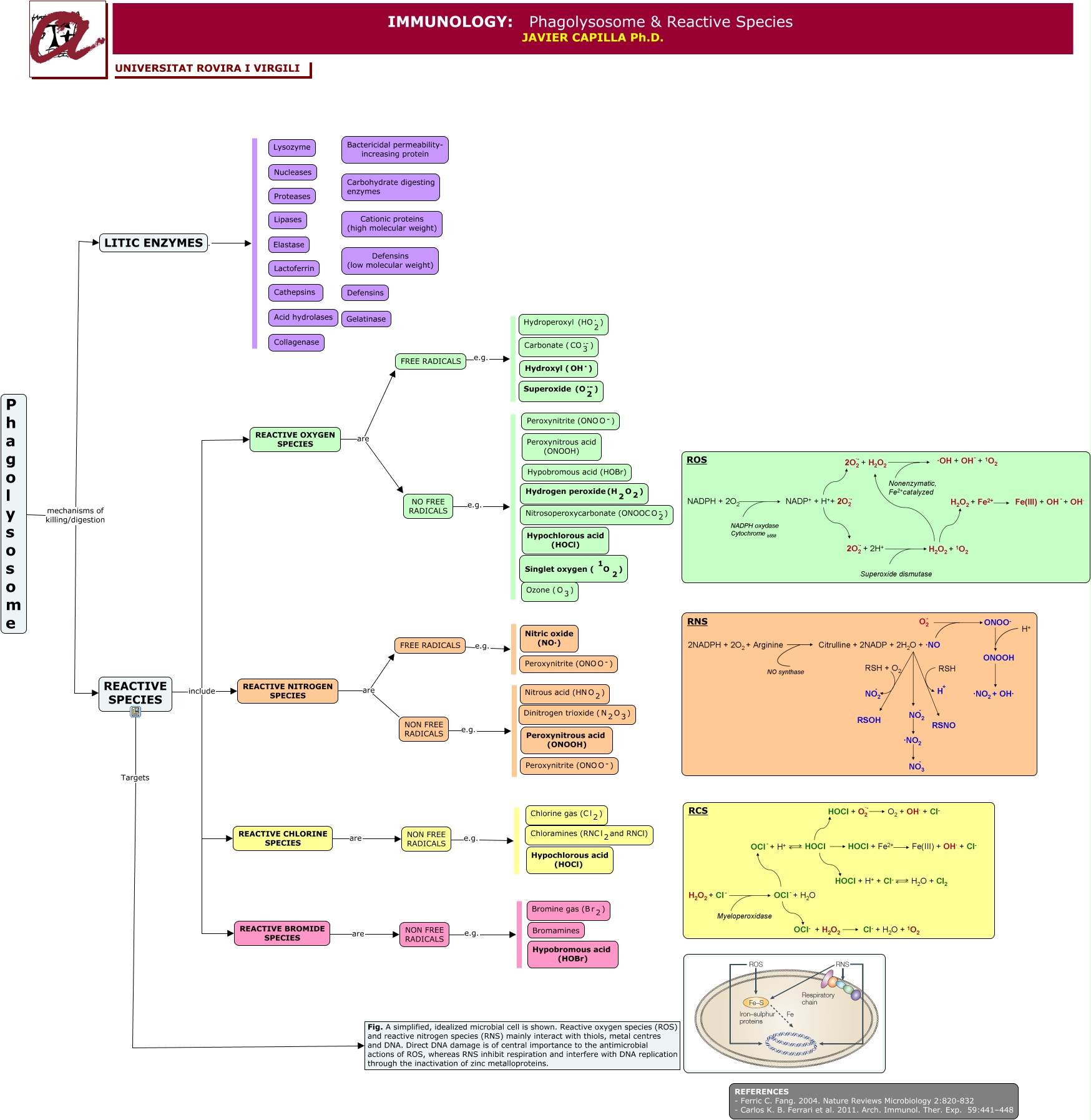 Aquest mapa conceptual conté informació relacionada amb: Burst, P h a g o l y s o s o m e mechanisms of killing/digestion LITIC ENZYMES, FREE RADICALS e.g., REACTIVE OXYGEN SPECIES are NO FREE RADICALS, NON FREE RADICALS e.g., REACTIVE BROMIDE SPECIES are NON FREE RADICALS, REACTIVE NITROGEN SPECIES are NON FREE RADICALS, REACTIVE NITROGEN SPECIES are FREE RADICALS, LITIC ENZYMES i.e., REACTIVE CHLORINE SPECIES are NON FREE RADICALS, REACTIVE SPECIES include REACTIVE CHLORINE SPECIES, FREE RADICALS e.g., NON FREE RADICALS e.g., NON FREE RADICALS e.g., REACTIVE OXYGEN SPECIES are FREE RADICALS, NO FREE RADICALS e.g., REACTIVE SPECIES include REACTIVE NITROGEN SPECIES, REACTIVE SPECIES Targets Fig. A simplified, idealized microbial cell is shown. Reactive oxygen species (ROS) and reactive nitrogen species (RNS) mainly interact with thiols, metal centres and DNA. Direct DNA damage is of central importance to the antimicrobial actions of ROS, whereas RNS inhibit respiration and interfere with DNA replication through the inactivation of zinc metalloproteins., P h a g o l y s o s o m e mechanisms of killing/digestion REACTIVE SPECIES, REACTIVE SPECIES include REACTIVE OXYGEN SPECIES, REACTIVE SPECIES include REACTIVE BROMIDE SPECIES