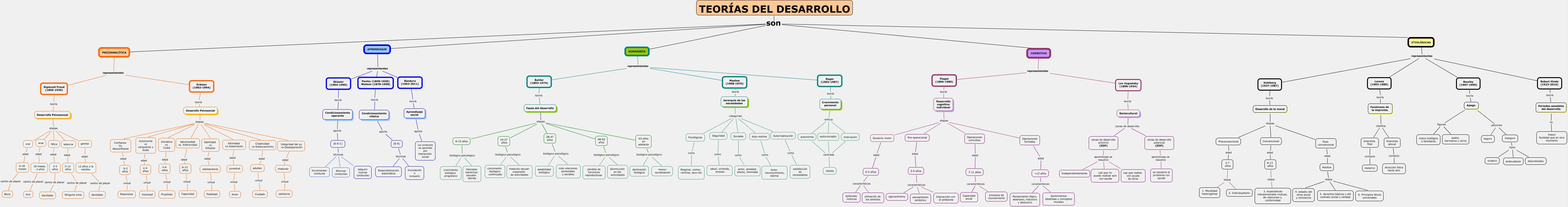 Este Cmap, tiene información relacionada con: TEORÍAS DEL DESARROLLO_REPRESENTANTES, APRENDIZAJE representantes Pavlov (1849-1936) Watson (1878-1958), Buhler (1893-1974) teoría Fases del desarrollo, (E-R-C) técnicas Adquirir nuevas conductas, 18 meses - 3 años centro de placer Ano, Desarrollo cognitivo individual etapas Operaciones formales, fálica edad 3-5 años, Desarollo Psicosocial etapas laboriosidad vs. Inferioridad, Desarollo Psicosocial etapas Integridad del yo vs Desesperación, 0-15 años biológico-psicológico crecimiento biológico progresivo, 2-6 años características egocentrismo, Adultos etapa 5. derechos básicos y del contrato social y utilidad, ETIOLÓGICAS representantes Bowlby (1907-1990), adultez virtud Ciudado, 28-47 años biológico-psicológico más relaciones personales y sociales., Desarollo de la moral etapas Preconvencional, Piaget (1896-1980) teoría Desarrollo cognitivo individual, ETIOLÓGICAS representantes Kohlberg (1927-1987), Intimidad vs Aislamiento edad juventud, Pre-operacional edad 2-6 años, Apego patrones seguro