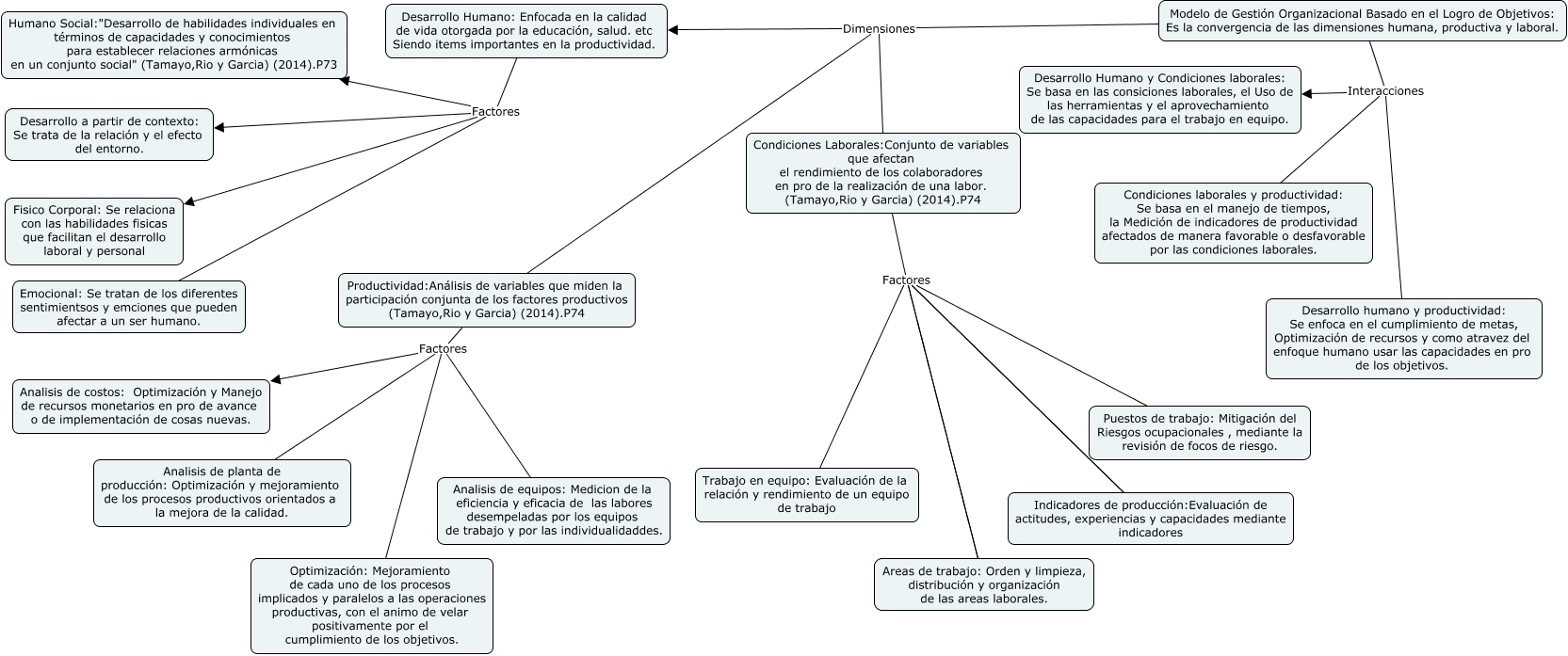 Este Cmap, tiene información relacionada con: GESTIÓN BASADA EN OBJETIVOS, Productividad:Análisis de variables que miden la participación conjunta de los factores productivos (Tamayo,Rio y Garcia) (2014).P74 Factores Optimización: Mejoramiento de cada uno de los procesos implicados y paralelos a las operaciones productivas, con el animo de velar positivamente por el cumplimiento de los objetivos., Condiciones Laborales:Conjunto de variables que afectan el rendimiento de los colaboradores en pro de la realización de una labor. (Tamayo,Rio y Garcia) (2014).P74 Factores Indicadores de producción:Evaluación de actitudes, experiencias y capacidades mediante indicadores, Desarrollo Humano: Enfocada en la calidad de vida otorgada por la educación, salud. etc Siendo items importantes en la productividad. Factores Humano Social:"Desarrollo de habilidades individuales en términos de capacidades y conocimientos para establecer relaciones armónicas en un conjunto social" (Tamayo,Rio y Garcia) (2014).P73, Condiciones Laborales:Conjunto de variables que afectan el rendimiento de los colaboradores en pro de la realización de una labor. (Tamayo,Rio y Garcia) (2014).P74 Factores Areas de trabajo: Orden y limpieza, distribución y organización de las areas laborales., Condiciones Laborales:Conjunto de variables que afectan el rendimiento de los colaboradores en pro de la realización de una labor. (Tamayo,Rio y Garcia) (2014).P74 Factores Puestos de trabajo: Mitigación del Riesgos ocupacionales , mediante la revisión de focos de riesgo., Desarrollo humano y productividad: Se enfoca en el cumplimiento de metas, Optimización de recursos y como atravez del enfoque humano usar las capacidades en pro de los objetivos. Interacciones Condiciones laborales y productividad: Se basa en el manejo de tiempos, la Medición de indicadores de productividad afectados de manera favorable o desfavorable por las condiciones laborales., Condiciones Laborales:Conjunto de variables que afectan el rendimiento de los colaboradores en pro de la realización de una labor. (Tamayo,Rio y Garcia) (2014).P74 Factores Indicadores de producción:Evaluación de actitudes, experiencias y capacidades mediante indicadores, Desarrollo humano y productividad: Se enfoca en el cumplimiento de metas, Optimización de recursos y como atravez del enfoque humano usar las capacidades en pro de los objetivos. Interacciones Desarrollo Humano y Condiciones laborales: Se basa en las consiciones laborales, el Uso de las herramientas y el aprovechamiento de las capacidades para el trabajo en equipo., Modelo de Gestión Organizacional Basado en el Logro de Objetivos: Es la convergencia de las dimensiones humana, productiva y laboral. Interacciones Condiciones laborales y productividad: Se basa en el manejo de tiempos, la Medición de indicadores de productividad afectados de manera favorable o desfavorable por las condiciones laborales., Desarrollo Humano: Enfocada en la calidad de vida otorgada por la educación, salud. etc Siendo items importantes en la productividad. Factores Desarrollo a partir de contexto: Se trata de la relación y el efecto del entorno., Productividad:Análisis de variables que miden la participación conjunta de los factores productivos (Tamayo,Rio y Garcia) (2014).P74 Factores Analisis de equipos: Medicion de la eficiencia y eficacia de las labores desempeladas por los equipos de trabajo y por las individualidaddes., Productividad:Análisis de variables que miden la participación conjunta de los factores productivos (Tamayo,Rio y Garcia) (2014).P74 Factores Analisis de planta de producción: Optimización y mejoramiento de los procesos productivos orientados a la mejora de la calidad., Desarrollo Humano: Enfocada en la calidad de vida otorgada por la educación, salud. etc Siendo items importantes en la productividad. Factores Fisico Corporal: Se relaciona con las habilidades fisicas que facilitan el desarrollo laboral y personal, Desarrollo Humano: Enfocada en la calidad de vida otorgada por la educación, salud. etc Siendo items importantes en la productividad. Factores Emocional: Se tratan de los diferentes sentimientsos y emciones que pueden afectar a un ser humano., Modelo de Gestión Organizacional Basado en el Logro de Objetivos: Es la convergencia de las dimensiones humana, productiva y laboral. Dimensiones Productividad:Análisis de variables que miden la participación conjunta de los factores productivos (Tamayo,Rio y Garcia) (2014).P74, Modelo de Gestión Organizacional Basado en el Logro de Objetivos: Es la convergencia de las dimensiones humana, productiva y laboral. Dimensiones Desarrollo Humano: Enfocada en la calidad de vida otorgada por la educación, salud. etc Siendo items importantes en la productividad., Modelo de Gestión Organizacional Basado en el Logro de Objetivos: Es la convergencia de las dimensiones humana, productiva y laboral. Interacciones Desarrollo Humano y Condiciones laborales: Se basa en las consiciones laborales, el Uso de las herramientas y el aprovechamiento de las capacidades para el trabajo en equipo., Productividad:Análisis de variables que miden la participación conjunta de los factores productivos (Tamayo,Rio y Garcia) (2014).P74 Factores Analisis de costos: Optimización y Manejo de recursos monetarios en pro de avance o de implementación de cosas nuevas., Condiciones Laborales:Conjunto de variables que afectan el rendimiento de los colaboradores en pro de la realización de una labor. (Tamayo,Rio y Garcia) (2014).P74 Factores Trabajo en equipo: Evaluación de la relación y rendimiento de un equipo de trabajo, Condiciones Laborales:Conjunto de variables que afectan el rendimiento de los colaboradores en pro de la realización de una labor. (Tamayo,Rio y Garcia) (2014).P74 Factores Areas de trabajo: Orden y limpieza, distribución y organización de las areas laborales.