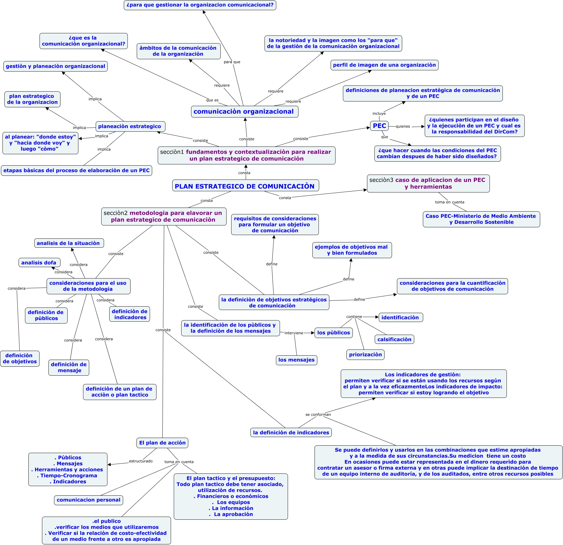 Este Cmap, tiene información relacionada con: PEC, consideraciones para el uso de la metodologia considera definiciòn de un plan de acciòn o plan tactico, planeaciòn estrategico implica plan estrategico de la organizacion, consideraciones para el uso de la metodologia considera analisis dofa, la definición de indicadores se conforman Se puede definirlos y usarlos en las combinaciones que estime apropiadas y a la medida de sus circunstancias.Su medicion tiene un costo En ocasiones puede estar representada en el dinero requerido para contratar un asesor o firma externa y en otras puede implicar la destinación de tiempo de un equipo interno de auditoría, y de los auditados, entre otros recursos posibles, El plan de acción toma en cuenta .el publico .verificar los medios que utilizaremos . Verificar si la relación de costo-efectividad de un medio frente a otro es apropiada, PLAN ESTRATEGICO DE COMUNICACIÒN consta secciòn3 caso de aplicacion de un PEC y herramientas, la definiciòn de objetivos estratègicos de comunicaciòn define requisitos de consideraciones para formular un objetivo de comunicaciòn, los pùblicos contiene priorizaciòn, consideraciones para el uso de la metodologia considera definiciòn de pùblicos, PEC incluye definiciones de planeacion estratègica de comunicaciòn y de un PEC, la identificaciòn de los pùblicos y la definiciòn de los mensajes interviene los mensajes, El plan de acción toma en cuenta El plan tactico y el presupuesto: Todo plan tactico debe tener asociado, utilización de recursos. . Financieros o económicos . Los equipos . La información . La aprobación, PEC quienes ¿quienes participan en el diseño y la ejecuciòn de un PEC y cual es la responsabilidad del DirCom?, secciòn2 metodologia para elavorar un plan estrategico de comunicaciòn consiste la definiciòn de objetivos estratègicos de comunicaciòn, planeaciòn estrategico implica al planear: "donde estoy" y "hacia donde voy" y luego "còmo", planeaciòn estrategico implica gestiòn y planeaciòn organizacional, comunicaciòn organizacional para que ¿para que gestionar la organizacion comunicacional?, comunicaciòn organizacional que es ¿que es la comunicaciòn organizacional?, secciòn1 fundamentos y contextualizaciòn para realizar un plan estrategico de comunicaciòn consiste PEC, secciòn1 fundamentos y contextualizaciòn para realizar un plan estrategico de comunicaciòn consiste comunicaciòn organizacional