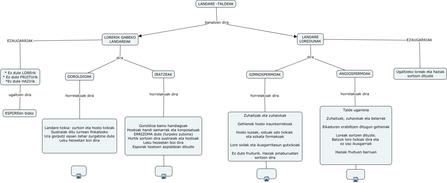 Este Cmap, tiene información relacionada con: LANDARE-TALDEAK 1, Goroldioa baino handiagoak Hostoak handi samarrak eta konposatuak ERRIZOMA dute (lurpeko zutoina) Hortik sortzen dira sustraiak eta hostoak Leku hezeetan bizi dira Esporak hostoen azpialdean dituzte ????, LANDARE LOREDUNAK EZAUGARRIAK Ugaltzeko loreak eta haziak sortzen dituzte, LORERIK GABEKO LANDAREAK dira GOROLDIOAK, LANDARE -TALDEAK banatzen dira LANDARE LOREDUNAK, LANDARE -TALDEAK banatzen dira LORERIK GABEKO LANDAREAK, Talde ugariena Zuhaitzak, zuhaixkak eta belarrak Eikaduren erabiltzen ditugun gehienak Loreak sortzen dituzte. Batzuk lore txikiak dira eta ez oso ikusgarriak Haziak fruituen barruan ????, LORERIK GABEKO LANDAREAK EZAUGARRIAK * Ez dute LORErik * Ez dute FRUITUrik *Ez dute HAZIrik, IRATZEAK horrelakoak dira Goroldioa baino handiagoak Hostoak handi samarrak eta konposatuak ERRIZOMA dute (lurpeko zutoina) Hortik sortzen dira sustraiak eta hostoak Leku hezeetan bizi dira Esporak hostoen azpialdean dituzte, Zuhaitzak eta zuhaixkak Gehienak hosto iraunkorrekoak Hosto luzeak, estuak edo txikiak eta ezkata formakoak Lore soilak eta ikusgarritasun gutxikoak Ez dute fruiturik. Haziak pinaburuetan sortzen dira ????, LANDARE LOREDUNAK dira ANGIOSPERMOAK, GIMNOSPERMOAK horrelakoak dira Zuhaitzak eta zuhaixkak Gehienak hosto iraunkorrekoak Hosto luzeak, estuak edo txikiak eta ezkata formakoak Lore soilak eta ikusgarritasun gutxikoak Ez dute fruiturik. Haziak pinaburuetan sortzen dira, ANGIOSPERMOAK horrelakoak dira Talde ugariena Zuhaitzak, zuhaixkak eta belarrak Eikaduren erabiltzen ditugun gehienak Loreak sortzen dituzte. Batzuk lore txikiak dira eta ez oso ikusgarriak Haziak fruituen barruan, * Ez dute LORErik * Ez dute FRUITUrik *Ez dute HAZIrik ugaltzen dira ESPOREen bidez, LANDARE LOREDUNAK dira GIMNOSPERMOAK, GOROLDIOAK horrelakoak dira Landare txikia: zurtoin eta hosto txikiak Sustraiak ditu lurrean finkatzeko Ura gorputz osoan zehar zurgatzne dute Leku hezeetan bizi dira, LORERIK GABEKO LANDAREAK dira IRATZEAK