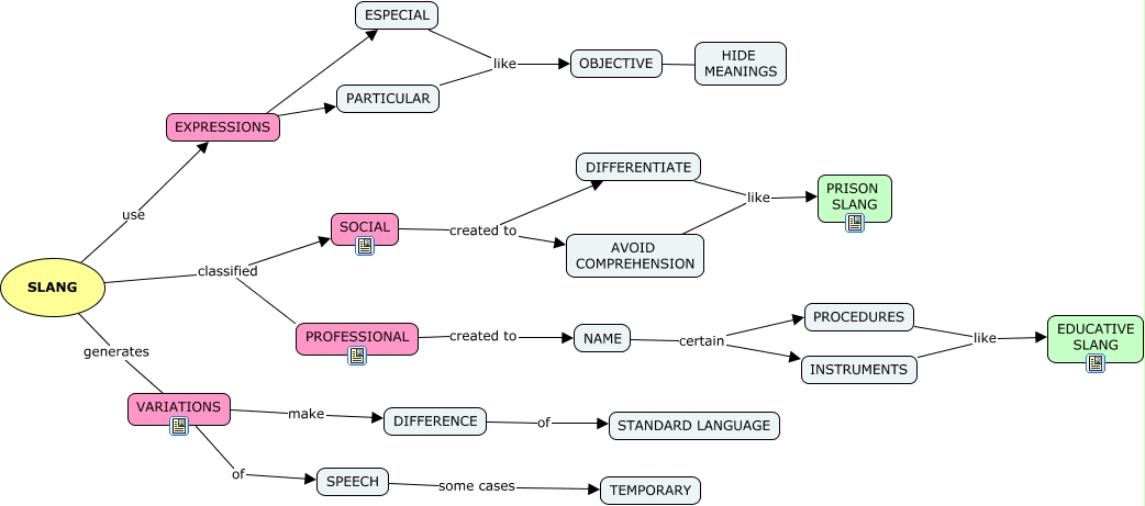 Este Cmap, tiene información relacionada con: SLANG, OBJECTIVE '' HIDE MEANINGS, EXPRESSIONS ???? ESPECIAL, SLANG classified PROFESSIONAL, SLANG generates VARIATIONS, SOCIAL created to DIFFERENTIATE, ESPECIAL like OBJECTIVE, SPEECH some cases TEMPORARY, SOCIAL created to AVOID COMPREHENSION, DIFFERENCE of STANDARD LANGUAGE, INSTRUMENTS like EDUCATIVE SLANG, AVOID COMPREHENSION like PRISON SLANG, PROCEDURES like EDUCATIVE SLANG, SLANG use EXPRESSIONS, EXPRESSIONS ???? PARTICULAR, PARTICULAR like OBJECTIVE, SLANG classified SOCIAL, PROFESSIONAL created to NAME, NAME certain PROCEDURES, VARIATIONS make DIFFERENCE, DIFFERENTIATE like PRISON SLANG