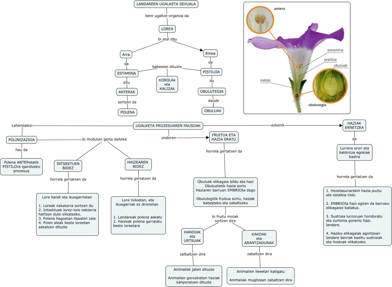 Este Cmap, tiene información relacionada con: LANDAREEN UGALKETA SEXUALA 3, UGALKETA PROZESUAREN PAUSOAK azkenik HAZIAK ERNETZEA, ANTERAK sortzen da POLENA, PISTILOA du OBULUTEGIA, ESTAMINA babesten dituzte KOROLAk eta KALIZAk, UGALKETA PROZESUAREN PAUSOAK Lehendabizi POLINIZAZIOA, Obuluek elikagaia bildu eta hazi Obuluetatik hazia sortu Haziaren barruan EMBRIOIa dago Obulutegitik fruitua sortu, haziak babesteko eta zabaltzeko bi fruitu motak sortzen dira KAKOAK eta ARANTZADUNAK, FRUITUA ETA HAZIA ERATU horrela gertatzen da Obuluek elikagaia bildu eta hazi Obuluetatik hazia sortu Haziaren barruan EMBRIOIa dago Obulutegitik fruitua sortu, haziak babesteko eta zabaltzeko, PISTILOA babesten dituzte KOROLAk eta KALIZAk, INTSEKTUEN BIDEZ horrela gertatzen da Lore handi eta ikusgarrietan 1. Loreak nekatarra sortzen du 2. Intsektuek lorez-lore nektarra hartzen dute elikatzeko. 3. Polena hegoetan itsasten zaie 4. Polen aleak beste loreetan askatzen dituzte, LOREA bi atal ditu Arra, UGALKETA PROZESUAREN PAUSOAK ondoren FRUITUA ETA HAZIA ERATU, Arra da ESTAMINA, POLINIZAZIOA bi modutan gerta daiteke HAIZEAREN BIDEZ, KAKOAK eta ARANTZADUNAK zabaltzen dira Animalien ileeetan katigatu Animaliak mugitzean zabaltzen dira, OBULUTEGIA daude OBULUAK, Obuluek elikagaia bildu eta hazi Obuluetatik hazia sortu Haziaren barruan EMBRIOIa dago Obulutegitik fruitua sortu, haziak babesteko eta zabaltzeko bi fruitu motak sortzen dira HANDIAK eta URTSUAK, HAZIAK ERNETZEA da Lurrera erori eta baldintza egokiak badira, LANDAREEN UGALKETA SEXUALA bere ugaltze-organoa da LOREA, HANDIAK eta URTSUAK zalbaltzen dira Animaliek jaten dituzte Animalien gorozkietan haziak kanporatzen dituzte, LOREA bi atal ditu Emea