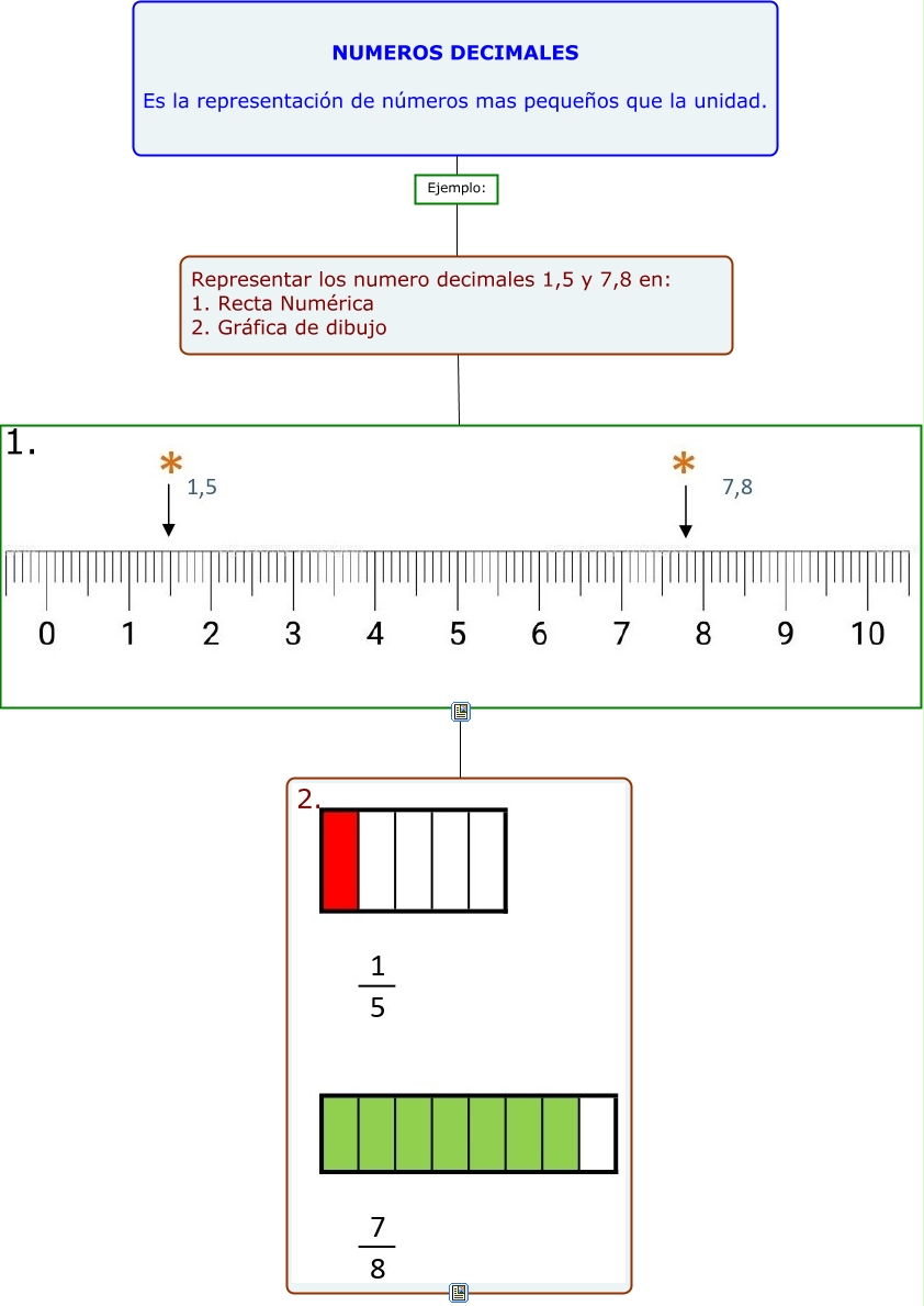 Este Cmap, tiene información relacionada con: NUMEROS DECIMALES, NUMEROS DECIMALES Es la representación de números mas pequeños que la unidad. Ejemplo: Representar los numero decimales 1,5 y 7,8 en: 1. Recta Numérica 2. Gráfica de dibujo, Representar los numero decimales 1,5 y 7,8 en: 1. Recta Numérica 2. Gráfica de dibujo 1. 2.