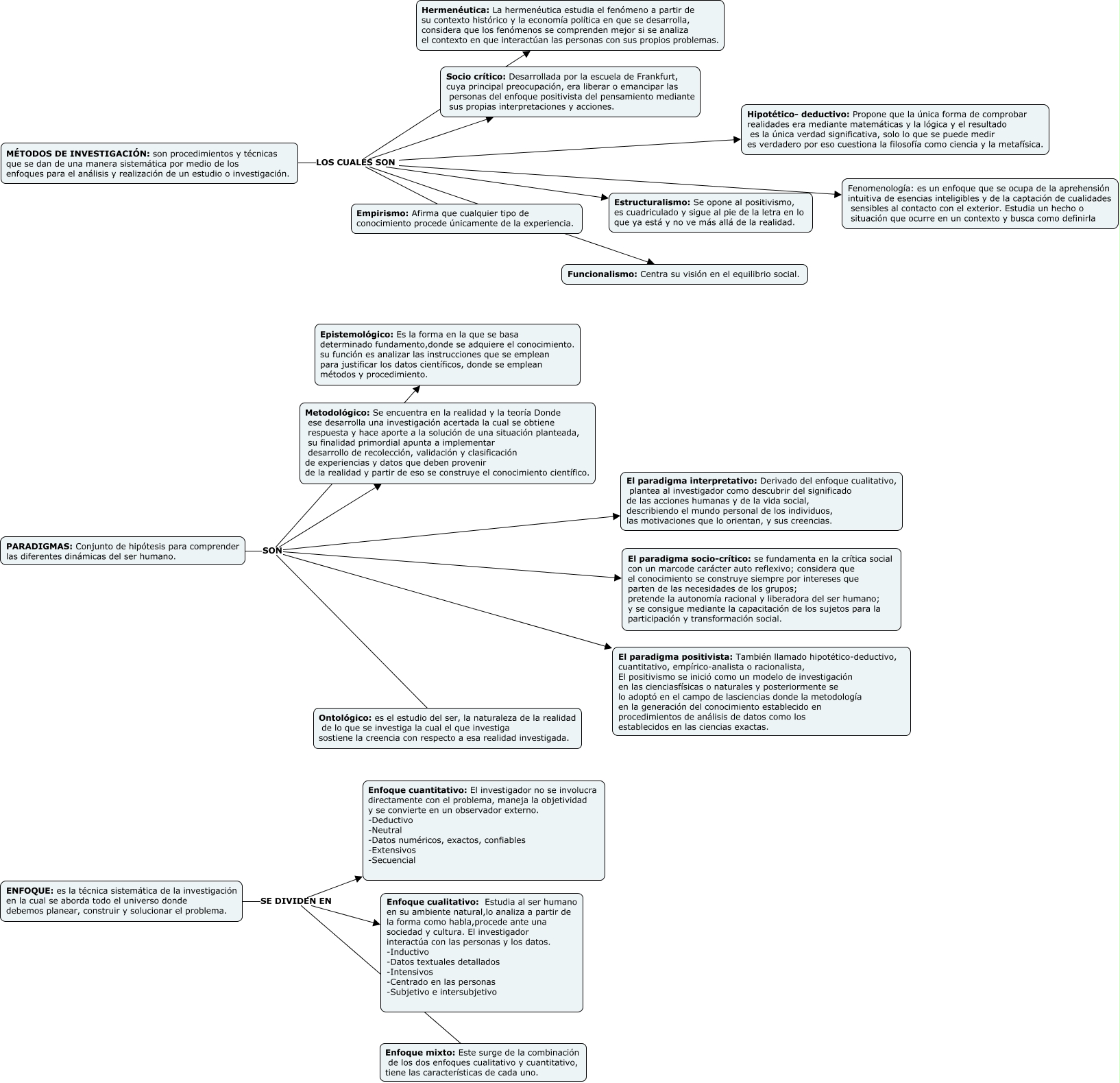 Este Cmap, tiene información relacionada con: ENFOQUES Y METODOS DE INVESTIGACIÓN, ENFOQUE: es la técnica sistemática de la investigación en la cual se aborda todo el universo donde debemos planear, construir y solucionar el problema. SE DIVIDEN EN Enfoque mixto: Este surge de la combinación de los dos enfoques cualitativo y cuantitativo, tiene las características de cada uno., PARADIGMAS: Conjunto de hipótesis para comprender las diferentes dinámicas del ser humano. SON Epistemológico: Es la forma en la que se basa determinado fundamento,donde se adquiere el conocimiento. su función es analizar las instrucciones que se emplean para justificar los datos científicos, donde se emplean métodos y procedimiento., PARADIGMAS: Conjunto de hipótesis para comprender las diferentes dinámicas del ser humano. SON El paradigma socio-crítico: se fundamenta en la crítica social con un marcode carácter auto reflexivo; considera que el conocimiento se construye siempre por intereses que parten de las necesidades de los grupos; pretende la autonomía racional y liberadora del ser humano; y se consigue mediante la capacitación de los sujetos para la participación y transformación social., MÉTODOS DE INVESTIGACIÓN: son procedimientos y técnicas que se dan de una manera sistemática por medio de los enfoques para el análisis y realización de un estudio o investigación. LOS CUALES SON Estructuralismo: Se opone al positivismo, es cuadriculado y sigue al pie de la letra en lo que ya está y no ve más allá de la realidad., MÉTODOS DE INVESTIGACIÓN: son procedimientos y técnicas que se dan de una manera sistemática por medio de los enfoques para el análisis y realización de un estudio o investigación. LOS CUALES SON Fenomenología: es un enfoque que se ocupa de la aprehensión intuitiva de esencias inteligibles y de la captación de cualidades sensibles al contacto con el exterior. Estudia un hecho o situación que ocurre en un contexto y busca como definirla, MÉTODOS DE INVESTIGACIÓN: son procedimientos y técnicas que se dan de una manera sistemática por medio de los enfoques para el análisis y realización de un estudio o investigación. LOS CUALES SON Hermenéutica: La hermenéutica estudia el fenómeno a partir de su contexto histórico y la economía política en que se desarrolla, considera que los fenómenos se comprenden mejor si se analiza el contexto en que interactúan las personas con sus propios problemas., MÉTODOS DE INVESTIGACIÓN: son procedimientos y técnicas que se dan de una manera sistemática por medio de los enfoques para el análisis y realización de un estudio o investigación. LOS CUALES SON Empirismo: Afirma que cualquier tipo de conocimiento procede únicamente de la experiencia., PARADIGMAS: Conjunto de hipótesis para comprender las diferentes dinámicas del ser humano. SON Ontológico: es el estudio del ser, la naturaleza de la realidad de lo que se investiga la cual el que investiga sostiene la creencia con respecto a esa realidad investigada., PARADIGMAS: Conjunto de hipótesis para comprender las diferentes dinámicas del ser humano. SON El paradigma positivista: También llamado hipotético-deductivo, cuantitativo, empírico-analista o racionalista, El positivismo se inició como un modelo de investigación en las cienciasfísicas o naturales y posteriormente se lo adoptó en el campo de lasciencias donde la metodología en la generación del conocimiento establecido en procedimientos de análisis de datos como los establecidos en las ciencias exactas., ENFOQUE: es la técnica sistemática de la investigación en la cual se aborda todo el universo donde debemos planear, construir y solucionar el problema. SE DIVIDEN EN Enfoque cualitativo: Estudia al ser humano en su ambiente natural,lo analiza a partir de la forma como habla,procede ante una sociedad y cultura. El investigador interactúa con las personas y los datos. -Inductivo -Datos textuales detallados -Intensivos -Centrado en las personas -Subjetivo e intersubjetivo, PARADIGMAS: Conjunto de hipótesis para comprender las diferentes dinámicas del ser humano. SON El paradigma interpretativo: Derivado del enfoque cualitativo, plantea al investigador como descubrir del significado de las acciones humanas y de la vida social, describiendo el mundo personal de los individuos, las motivaciones que lo orientan, y sus creencias., MÉTODOS DE INVESTIGACIÓN: son procedimientos y técnicas que se dan de una manera sistemática por medio de los enfoques para el análisis y realización de un estudio o investigación. LOS CUALES SON Funcionalismo: Centra su visión en el equilibrio social., PARADIGMAS: Conjunto de hipótesis para comprender las diferentes dinámicas del ser humano. SON Metodológico: Se encuentra en la realidad y la teoría Donde ese desarrolla una investigación acertada la cual se obtiene respuesta y hace aporte a la solución de una situación planteada, su finalidad primordial apunta a implementar desarrollo de recolección, validación y clasificación de experiencias y datos que deben provenir de la realidad y partir de eso se construye el conocimiento científico., MÉTODOS DE INVESTIGACIÓN: son procedimientos y técnicas que se dan de una manera sistemática por medio de los enfoques para el análisis y realización de un estudio o investigación. LOS CUALES SON Hipotético- deductivo: Propone que la única forma de comprobar realidades era mediante matemáticas y la lógica y el resultado es la única verdad significativa, solo lo que se puede medir es verdadero por eso cuestiona la filosofía como ciencia y la metafísica., MÉTODOS DE INVESTIGACIÓN: son procedimientos y técnicas que se dan de una manera sistemática por medio de los enfoques para el análisis y realización de un estudio o investigación. LOS CUALES SON Socio crítico: Desarrollada por la escuela de Frankfurt, cuya principal preocupación, era liberar o emancipar las personas del enfoque positiv