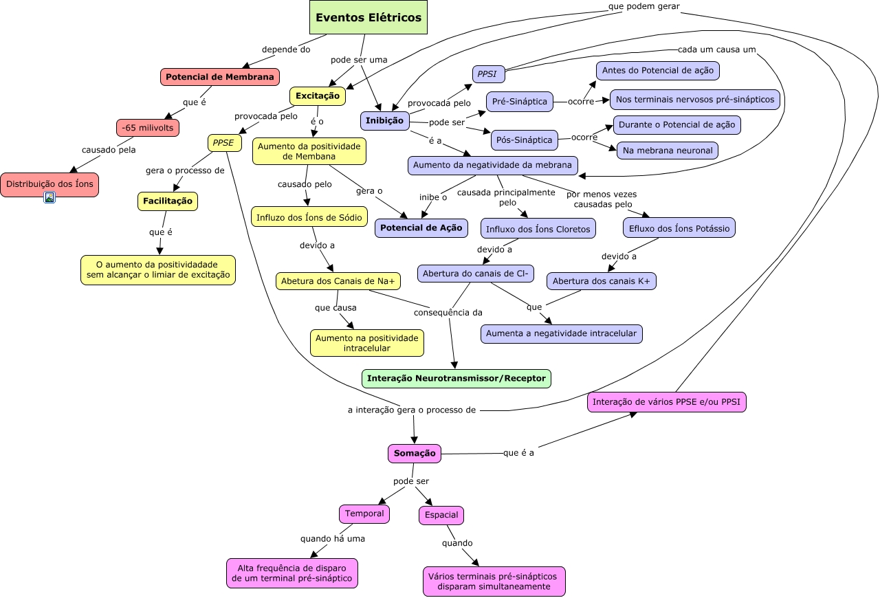 Esse mapa conceitual, produzido no IHMC CmapTools, tem a informação relacionada a: SN Isak, Espacial quando Vários terminais pré-sinápticos disparam simultaneamente, Influzo dos Íons de Sódio devido a Abetura dos Canais de Na+, Pré-Sináptica ocorre Antes do Potencial de ação, Aumento da negatividade da mebrana por menos vezes causadas pelo Efluxo dos Íons Potássio, Eventos Elétricos depende do Potencial de Membrana, Pós-Sináptica ocorre Durante o Potencial de ação, Eventos Elétricos pode ser uma Inibição, Aumento da positividade de Membana causado pelo Influzo dos Íons de Sódio, PPSE a interação gera o processo de PPSI, PPSI cada um causa um Aumento da negatividade da mebrana, Aumento da negatividade da mebrana inibe o Potencial de Ação, Eventos Elétricos pode ser uma Excitação, Abertura do canais de Cl- que Aumenta a negatividade intracelular, Abetura dos Canais de Na+ consequência da Interação Neurotransmissor/Receptor, Inibição provocada pelo PPSI, Facilitação que é O aumento da positividadade sem alcançar o limiar de excitação, PPSE gera o processo de Facilitação, Aumento da negatividade da mebrana causada principalmente pelo Influxo dos Íons Cloretos, Pós-Sináptica ocorre Na mebrana neuronal, Efluxo dos Íons Potássio devido a Abertura dos canais K+