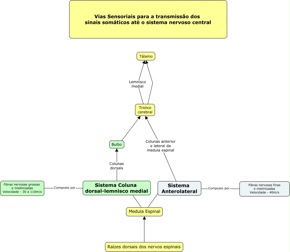 Esse mapa conceitual, produzido no IHMC CmapTools, tem a informação relacionada a: Vias Sensoriais de sinais somáticos para o SNC, Medula Espinal ???? Sistema Anterolateral, Raízes dorsais dos nervos espinais ???? Medula Espinal, Tronco cerebral ???? Tálamo, Sistema Coluna dorsal-lemnisco medial Composto por Fibras nervosas grossas e mielinizadas Velocidade - 30 a 110m/s, Bulbo ???? Tronco cerebral, Sistema Coluna dorsal-lemnisco medial Colunas dorsais Bulbo, Sistema Anterolateral Composto por Fibras nervosas finas e mielinizadas Velocidade - 40m/s, Sistema Anterolateral Colunas anterior e lateral da medula espinal Tronco cerebral, Medula Espinal ???? Sistema Coluna dorsal-lemnisco medial, Tronco cerebral Lemnisco medial Tálamo