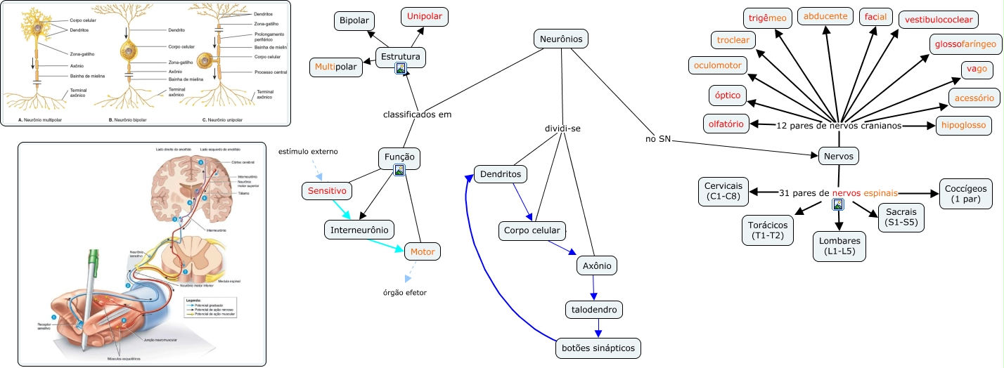 Esse mapa conceitual, produzido no IHMC CmapTools, tem a informação relacionada a: Classificação dos neurônios, Nervos 12 pares de nervos cranianos vestibulococlear, Estrutura ???? Multipolar, Corpo celular ???? Axônio, Nervos 12 pares de nervos cranianos olfatório, estímulo externo ???? Sensitivo, Nervos 31 pares de nervos espinais Coccígeos (1 par), Nervos 12 pares de nervos cranianos vago, Sensitivo Interneurônio, Nervos 12 pares de nervos cranianos oculomotor, Estrutura ???? Unipolar, Neurônios no SN Nervos, Nervos 31 pares de nervos espinais Cervicais (C1-C8), talodendro ???? botões sinápticos, Nervos 31 pares de nervos espinais Sacrais (S1-S5), Interneurônio ???? Motor, Neurônios classificados em Função, Nervos 12 pares de nervos cranianos óptico, Nervos 12 pares de nervos cranianos abducente, Nervos 12 pares de nervos cranianos glossofaríngeo, Neurônios classificados em Estrutura