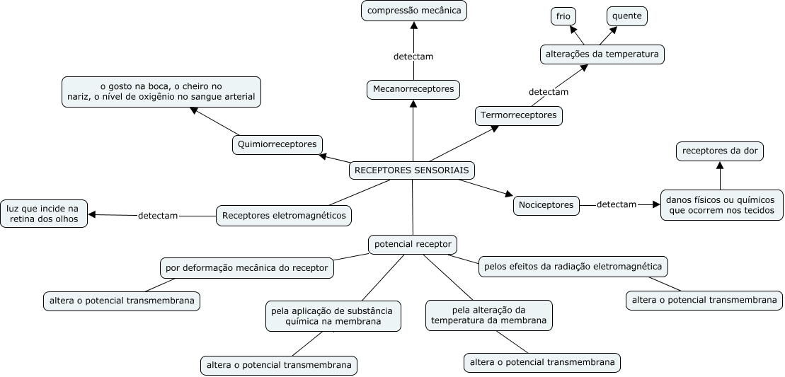 Esse mapa conceitual, produzido no IHMC CmapTools, tem a informação relacionada a: REECPTORES SENSORIAIS, Receptores eletromagnéticos detectam luz que incide na retina dos olhos, Nociceptores detectam danos físicos ou químicos que ocorrem nos tecidos, danos físicos ou químicos que ocorrem nos tecidos ???? receptores da dor, RECEPTORES SENSORIAIS ???? Termorreceptores, potencial receptor ???? pelos efeitos da radiação eletromagnética, RECEPTORES SENSORIAIS ???? Mecanorreceptores, Mecanorreceptores detectam compressão mecânica, por deformação mecânica do receptor ???? altera o potencial transmembrana, pelos efeitos da radiação eletromagnética ???? altera o potencial transmembrana, potencial receptor ???? pela aplicação de substância química na membrana, RECEPTORES SENSORIAIS ???? Quimiorreceptores, RECEPTORES SENSORIAIS ???? Receptores eletromagnéticos, Termorreceptores detectam alterações da temperatura, Quimiorreceptores ???? o gosto na boca, o cheiro no nariz, o nível de oxigênio no sangue arterial, potencial receptor ???? por deformação mecânica do receptor, pela aplicação de substância química na membrana ???? altera o potencial transmembrana, potencial receptor ???? pela alteração da temperatura da membrana, alterações da temperatura ???? frio, RECEPTORES SENSORIAIS ???? potencial receptor, RECEPTORES SENSORIAIS ???? Nociceptores