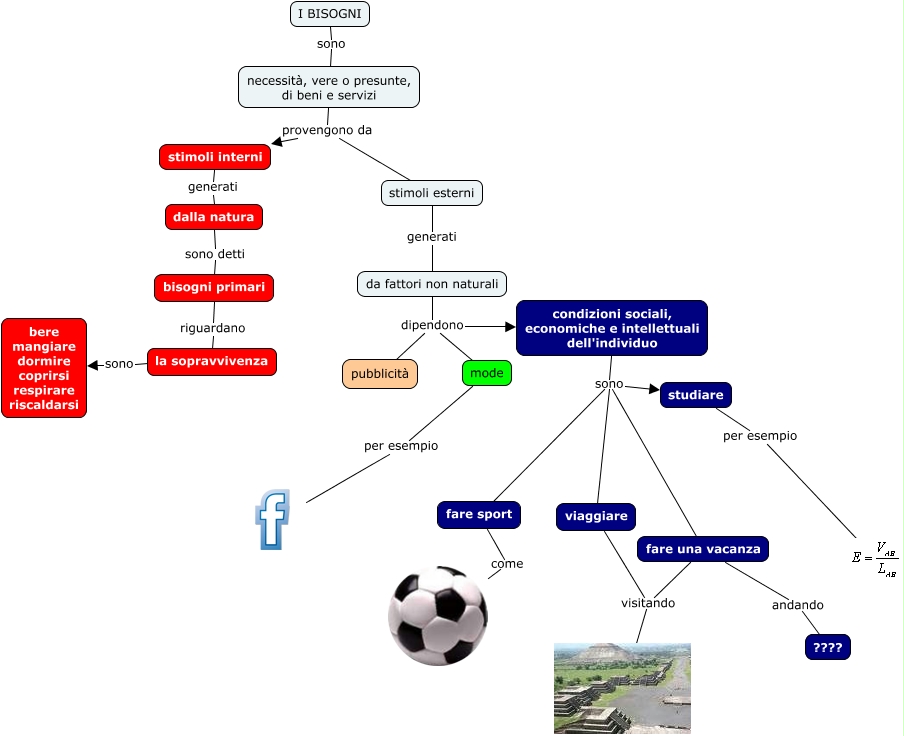 Questa Cmap, creata con IHMC CmapTools, contiene informazioni relative a: beni e bisogni, necessità, vere o presunte, di beni e servizi provengono da stimoli interni, viaggiare visitando, condizioni sociali, economiche e intellettuali dell'individuo sono studiare, da fattori non naturali dipendono pubblicità, dalla natura sono detti bisogni primari, stimoli esterni generati da fattori non naturali, da fattori non naturali dipendono mode, la sopravvivenza sono bere mangiare dormire coprirsi respirare riscaldarsi, bisogni primari riguardano la sopravvivenza, fare sport come, condizioni sociali, economiche e intellettuali dell'individuo sono viaggiare, studiare per esempio, I BISOGNI sono necessità, vere o presunte, di beni e servizi, condizioni sociali, economiche e intellettuali dell'individuo sono fare una vacanza, mode per esempio, stimoli interni generati dalla natura, fare una vacanza andando ????, da fattori non naturali dipendono condizioni sociali, economiche e intellettuali dell'individuo, condizioni sociali, economiche e intellettuali dell'individuo sono fare sport, fare una vacanza visitando
