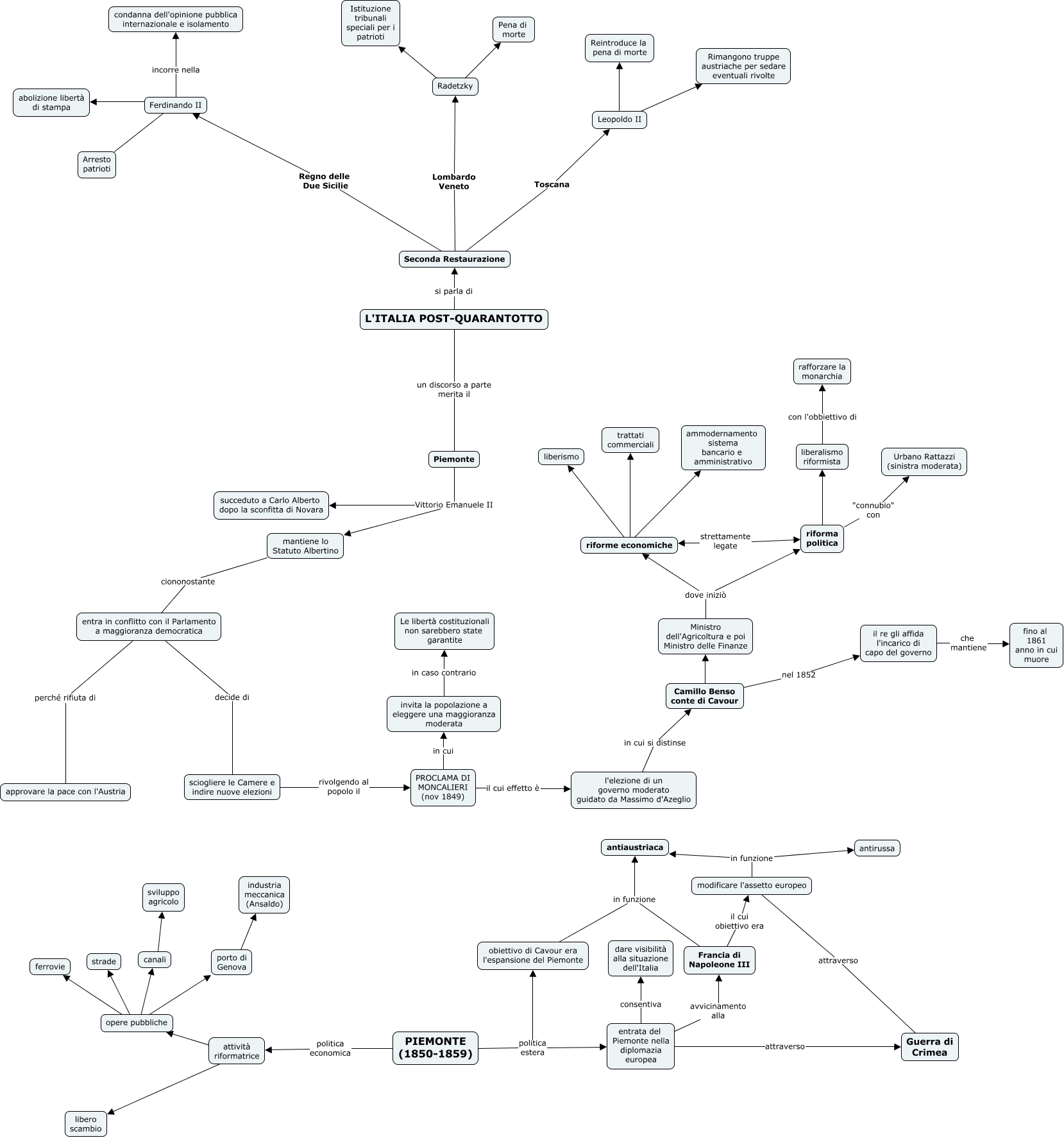 Questa Cmap, creata con IHMC CmapTools, contiene informazioni relative a: Italia post-quarantotto, Seconda Restaurazione Regno delle Due Sicilie Ferdinando II, Ministro dell'Agricoltura e poi Ministro delle Finanze dove iniziò riforme economiche, modificare l'assetto europeo attraverso Guerra di Crimea, Camillo Benso conte di Cavour Ministro dell'Agricoltura e poi Ministro delle Finanze, entra in conflitto con il Parlamento a maggioranza democratica perché rifiuta di approvare la pace con l'Austria, PROCLAMA DI MONCALIERI (nov 1849) il cui effetto è l'elezione di un governo moderato guidato da Massimo d'Azeglio, entrata del Piemonte nella diplomazia europea avvicinamento alla Francia di Napoleone III, sciogliere le Camere e indire nuove elezioni rivolgendo al popolo il PROCLAMA DI MONCALIERI (nov 1849), entra in conflitto con il Parlamento a maggioranza democratica decide di sciogliere le Camere e indire nuove elezioni, Camillo Benso conte di Cavour nel 1852 il re gli affida l'incarico di capo del governo, opere pubbliche ???? canali, porto di Genova ???? industria meccanica (Ansaldo), Radetzky ???? Pena di morte, Ferdinando II incorre nella condanna dell'opinione pubblica internazionale e isolamento, riforma politica "connubio" con Urbano Rattazzi (sinistra moderata), riforma politica ???? liberalismo riformista, mantiene lo Statuto Albertino ciononostante entra in conflitto con il Parlamento a maggioranza democratica, riforme economiche ???? liberismo, PIEMONTE (1850-1859) politica estera entrata del Piemonte nella diplomazia europea, riforme economiche ???? trattati commerciali