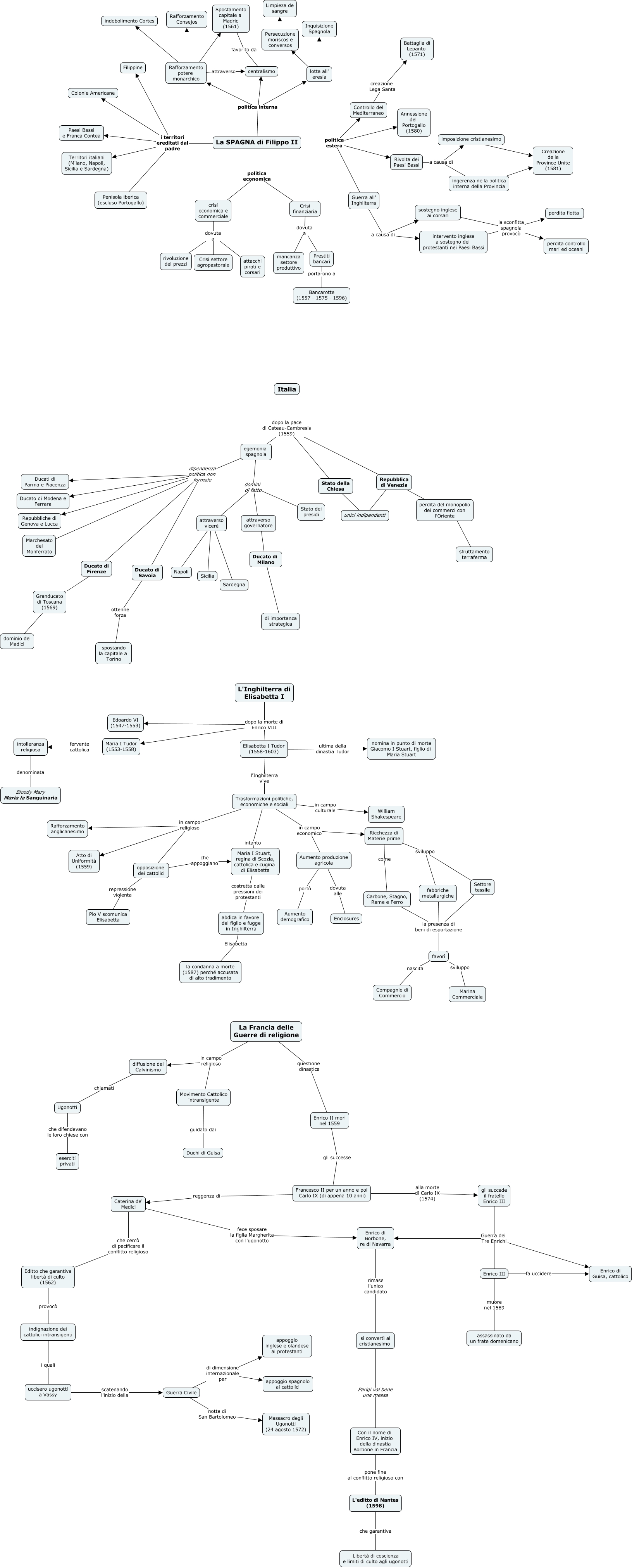 Questa Cmap, creata con IHMC CmapTools, contiene informazioni relative a: Europa Seconda Metà Cinquecento, ingerenza nella politica interna della Provincia ???? Creazione delle Province Unite (1581), egemonia spagnola domini di fatto attraverso governatore, sostegno inglese ai corsari la sconfitta spagnola provocò perdita controllo mari ed oceani, Aumento produzione agricola dovuta alle Enclosures, Crisi finanziaria dovuta a Prestiti bancari, La SPAGNA di Filippo II i territori ereditati dal padre Territori italiani (Milano, Napoli, Sicilia e Sardegna), La SPAGNA di Filippo II politica interna lotta all' eresia, crisi economica e commerciale dovuta a attacchi pirati e corsari, Francesco II per un anno e poi Carlo IX (di appena 10 anni) reggenza di Caterina de' Medici, La SPAGNA di Filippo II politica interna centralismo, si convertì al cristianesimo Parigi val bene una messa Con il nome di Enrico IV, inizio della dinastia Borbone in Francia, Ducato di Milano ???? di importanza strategica, egemonia spagnola dipendenza politica non formale Ducato di Modena e Ferrara, Rivolta dei Paesi Bassi a causa di ingerenza nella politica interna della Provincia, La Francia delle Guerre di religione in campo religioso diffusione del Calvinismo, Carbone, Stagno, Rame e Ferro la presenza di beni di esportazione favorì, Italia dopo la pace di Cateau-Cambresis (1559) Repubblica di Venezia, Enrico II morì nel 1559 gli successe Francesco II per un anno e poi Carlo IX (di appena 10 anni), La SPAGNA di Filippo II politica estera Rivolta dei Paesi Bassi, Ducato di Savoia ottenne forza spostando la capitale a Torino