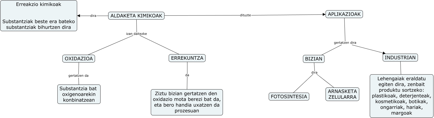 Este Cmap, tiene información relacionada con: Aldaketa kimikoak 4 osatuta, ALDAKETA KIMIKOAK izan daitezke OXIDAZIOA, ALDAKETA KIMIKOAK izan daitezke ERREKUNTZA, APLIKAZIOAK gertatzen dira BIZIAN, ALDAKETA KIMIKOAK dituzte APLIKAZIOAK, OXIDAZIOA gertatzen da Substantzia bat oxigenoarekin konbinatzean, BIZIAN dira FOTOSINTESIA, BIZIAN dira ARNASKETA ZELULARRA, ALDAKETA KIMIKOAK dira Erreakzio kimikoak Substantziak beste era bateko substantziak bihurtzen dira, INDUSTRIAN ???? Lehengaiak eraldatu egiten dira, zenbait produktu sortzeko: plastikoak, deterjenteak, kosmetikoak, botikak, ongarriak, hariak, margoak, APLIKAZIOAK gertatzen dira INDUSTRIAN, ERREKUNTZA da Ziztu bizian gertatzen den oxidazio mota berezi bat da, eta bero handia uxatzen da prozesuan