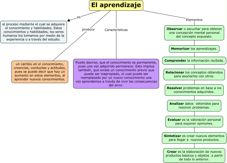 Este Cmap, tiene información relacionada con: El Aprendizaje, El aprendizaje es el proceso mediante el cual se adquiere el conocimiento y habilidades. Estos conocimientos y habilidades, los seres humanos los tomamos por medio de la experiencia o a través del estudio., El aprendizaje Elementos Memorizar los aprendizajes., El aprendizaje Elementos Crear es la elaboración de nuevos productos básicos y objetos a partir de todo lo anterior., El aprendizaje Elementos Comprender la información recibida., El aprendizaje Elementos Resolver problemas en base a los conocimientos adquiridos., El aprendizaje produce un cambio en el conocimiento, creencias, conductas y actitudes, pues se puede decir que hay un aumento en estos elementos, al aprender nuevos conocimientos., El aprendizaje Elementos Evaluar es la valoración personal para exponer opiniones., El aprendizaje Elementos Sintetizar es crear nuevos elementos para llegar a nuevos productos., El aprendizaje Elementos Analizar datos obtenidos para resolver problemas., El aprendizaje Elementos Relacionar los conceptos obtenidos para asociarlos con otros., El aprendizaje Características Puede decirse, que el conocimiento es permanente, pues una vez adquirido permanece. Esto implica también, que existe un conocimiento previo que puede ser inapropiado, el cual puede ser reemplazado por un nuevo conocimiento una vez aprendemos a través de vivir las consecuencias del error., El aprendizaje Elementos Observar o escuchar para obtener una concepción mental personal del concepto expuesto.