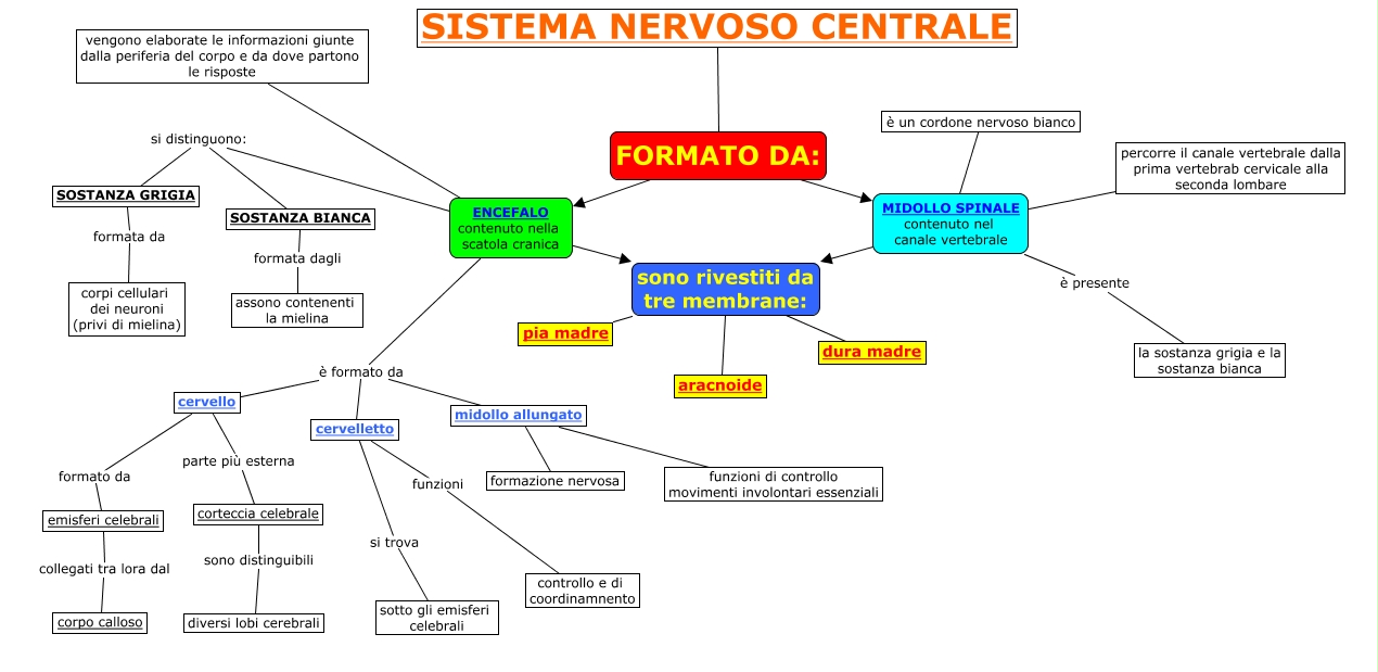 Questa Cmap, creata con IHMC CmapTools, contiene informazioni relative a: mappa SNC, MIDOLLO SPINALE contenuto nel canale vertebrale percorre il canale vertebrale dalla prima vertebrab cervicale alla seconda lombare, MIDOLLO SPINALE contenuto nel canale vertebrale sono rivestiti da tre membrane: pia madre, SOSTANZA BIANCA formata dagli assono contenenti la mielina, cervello parte più esterna corteccia celebrale, emisferi celebrali collegati tra lora dal corpo calloso, cervelletto funzioni controllo e di coordinamnento, cervello formato da emisferi celebrali, MIDOLLO SPINALE contenuto nel canale vertebrale sono rivestiti da tre membrane: dura madre, midollo allungato formazione nervosa, ENCEFALO contenuto nella scatola cranica sono rivestiti da tre membrane: aracnoide, corteccia celebrale sono distinguibili diversi lobi cerebrali, ENCEFALO contenuto nella scatola cranica si distinguono: SOSTANZA BIANCA, MIDOLLO SPINALE contenuto nel canale vertebrale sono rivestiti da tre membrane: aracnoide, cervelletto si trova sotto gli emisferi celebrali, SISTEMA NERVOSO CENTRALE FORMATO DA: ENCEFALO contenuto nella scatola cranica, ENCEFALO contenuto nella scatola cranica sono rivestiti da tre membrane: dura madre, ENCEFALO contenuto nella scatola cranica si distinguono: SOSTANZA GRIGIA, SOSTANZA GRIGIA formata da corpi cellulari dei neuroni (privi di mielina), ENCEFALO contenuto nella scatola cranica è formato da cervello, midollo allungato funzioni di controllo movimenti involontari essenziali