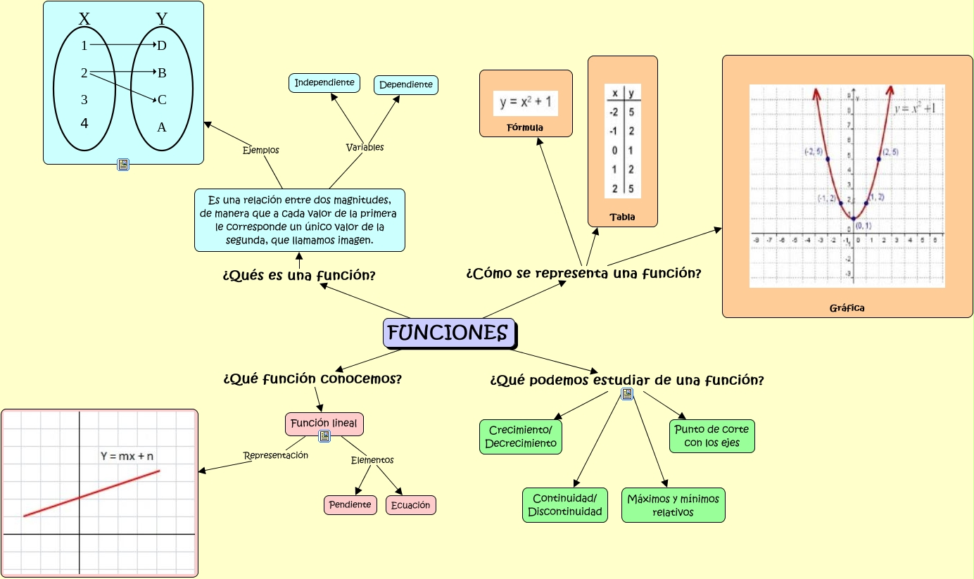 Este Cmap, tiene información relacionada con: Funciones 4, FUNCIONES ¿Qué podemos estudiar de una función? Crecimiento/ Decrecimiento, Es una relación entre dos magnitudes, de manera que a cada valor de la primera le corresponde un único valor de la segunda, que llamamos imagen. Variables Independiente, Función lineal Elementos Pendiente, FUNCIONES ¿Qué podemos estudiar de una función? Punto de corte con los ejes, Función lineal Representación, FUNCIONES ¿Qué función conocemos? Función lineal, Es una relación entre dos magnitudes, de manera que a cada valor de la primera le corresponde un único valor de la segunda, que llamamos imagen. Ejemplos, FUNCIONES ¿Qué podemos estudiar de una función? Máximos y mínimos relativos, FUNCIONES ¿Cómo se representa una función? Fórmula, Es una relación entre dos magnitudes, de manera que a cada valor de la primera le corresponde un único valor de la segunda, que llamamos imagen. Variables Dependiente, FUNCIONES ¿Cómo se representa una función? Tabla, Función lineal Elementos Ecuación, FUNCIONES ¿Qués es una función? Es una relación entre dos magnitudes, de manera que a cada valor de la primera le corresponde un único valor de la segunda, que llamamos imagen., FUNCIONES ¿Qué podemos estudiar de una función? Continuidad/ Discontinuidad, FUNCIONES ¿Cómo se representa una función? Gráfica