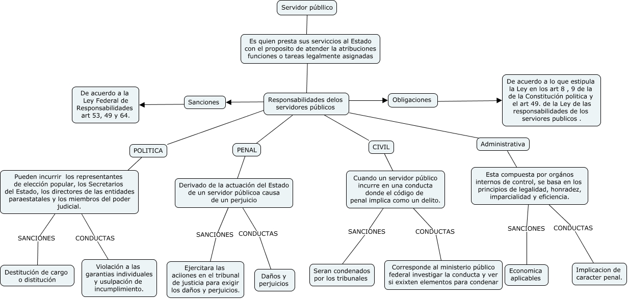 Este Cmap, tiene información relacionada con: Responsabilidades del swrvidor público, Cuando un servidor público incurre en una conducta donde el código de penal implica como un delito. CONDUCTAS Corresponde al ministerio público federal investigar la conducta y ver si exixten elementos para condenar, POLITICA ???? Pueden incurrir los representantes de elección popular, los Secretarios del Estado, los directores de las entidades paraestatales y los miembros del poder judicial., Pueden incurrir los representantes de elección popular, los Secretarios del Estado, los directores de las entidades paraestatales y los miembros del poder judicial. SANCIONES Destitución de cargo o distitución, Responsabilidades delos servidores públicos ???? Sanciones, CIVIL ???? Cuando un servidor público incurre en una conducta donde el código de penal implica como un delito., Administrativa ???? Esta compuesta por orgános internos de control, se basa en los principios de legalidad, honradez, imparcialidad y eficiencia., Responsabilidades delos servidores públicos ???? POLITICA, Derivado de la actuación del Estado de un servidor públicoa causa de un perjuicio SANCIONES Ejercitara las aciiones en el tribunal de justicia para exigir los daños y perjuicios., Cuando un servidor público incurre en una conducta donde el código de penal implica como un delito. SANCIONES Seran condenados por los tribunales, Responsabilidades delos servidores públicos ???? PENAL, Derivado de la actuación del Estado de un servidor públicoa causa de un perjuicio CONDUCTAS Daños y perjuicios, Obligaciones ???? De acuerdo a lo que estipula la Ley en los art 8 , 9 de la de la Constitución politica y el art 49. de la Ley de las responsabilidades de los serviores publicos ., Servidor públlico ???? Es quien presta sus serviccios al Estado con el proposito de atender la atribuciones funciones o tareas legalmente asignadas, Responsabilidades delos servidores públicos ???? CIVIL, Es quien presta sus serviccios al Estado con el proposito de atender la atribuciones funciones o tareas legalmente asignadas ???? Responsabilidades delos servidores públicos, Esta compuesta por orgános internos de control, se basa en los principios de legalidad, honradez, imparcialidad y eficiencia. SANCIONES Economica aplicables, Pueden incurrir los representantes de elección popular, los Secretarios del Estado, los directores de las entidades paraestatales y los miembros del poder judicial. CONDUCTAS Violación a las garantias individuales y usulpación de incumplimiento., Responsabilidades delos servidores públicos ???? Administrativa, Sanciones ???? De acuerdo a la Ley Federal de Responsabilidades art 53, 49 y 64., Esta compuesta por orgános internos de control, se basa en los principios de legalidad, honradez, imparcialidad y eficiencia. CONDUCTAS Implicacion de caracter penal.