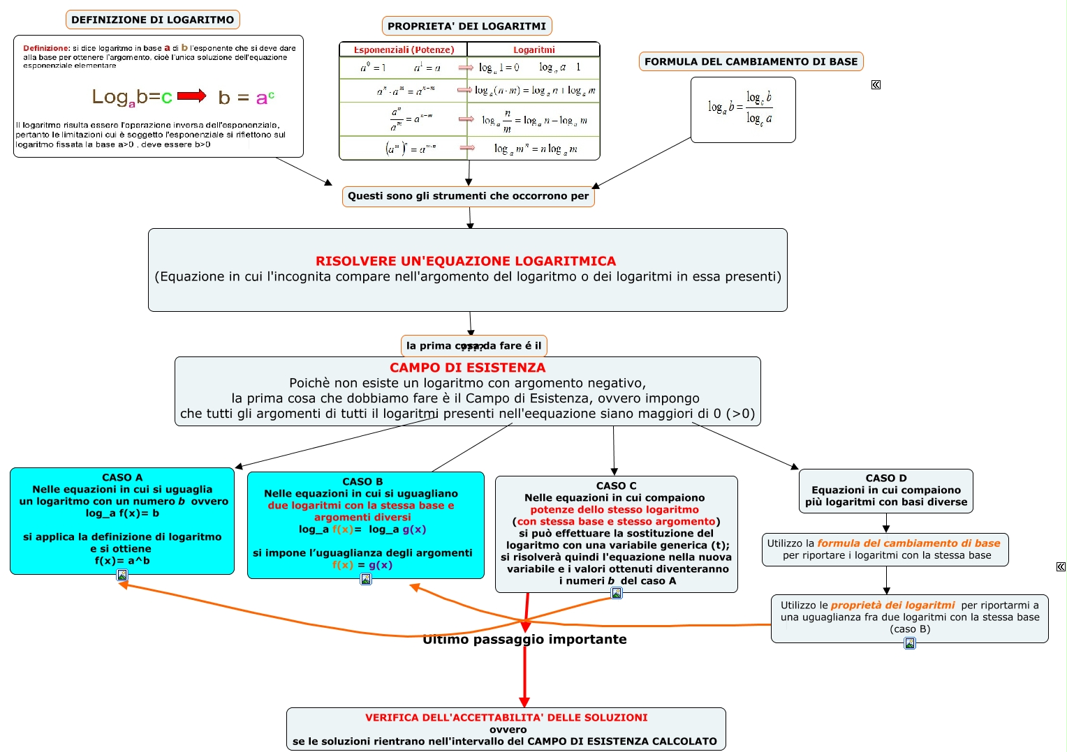 Questa Cmap, creata con IHMC CmapTools, contiene informazioni relative a: Equazioni logaritmiche, Questi sono gli strumenti che occorrono per,, RISOLVERE UN'EQUAZIONE LOGARITMICA (Equazione in cui l'incognita compare nell'argomento del logaritmo o dei logaritmi in essa presenti) ???? ????, CAMPO DI ESISTENZA Poichè non esiste un logaritmo con argomento negativo, la prima cosa che dobbiamo fare è il Campo di Esistenza, ovvero impongo che tutti gli argomenti di tutti il logaritmi presenti nell'eequazione siano maggiori di 0 (ɬ) ???? CASO D Equazioni in cui compaiono più logaritmi con basi diverse, CAMPO DI ESISTENZA Poichè non esiste un logaritmo con argomento negativo, la prima cosa che dobbiamo fare è il Campo di Esistenza, ovvero impongo che tutti gli argomenti di tutti il logaritmi presenti nell'eequazione siano maggiori di 0 (ɬ) ???? <math xmlns="http://www.w3.org/1998/Math/MathML"> <mtext> CASO A