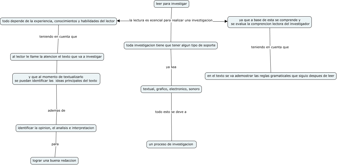 Este Cmap, tiene información relacionada con: leer para investigar, y que al momento de textualizarlo se puedan identificar las ideas principales del texto ademas de identificar la opinion, el analisis e interpretacion, leer para investigar la lectura es ecencial para realizar una inveztigacion todo depende de la experiencia, conocimientos y habilidades del lector, al lector le llame la atencion el texto que va a investigar ???? y que al momento de textualizarlo se puedan identificar las ideas principales del texto, todo depende de la experiencia, conocimientos y habilidades del lector teniendo en cuenta que al lector le llame la atencion el texto que va a investigar, leer para investigar la lectura es ecencial para realizar una inveztigacion toda investigacion tiene que tener algun tipo de soporte, leer para investigar la lectura es ecencial para realizar una inveztigacion ya que a base de esta se comprende y se evalua la comprencion lectora del investigador, ya que a base de esta se comprende y se evalua la comprencion lectora del investigador teniendo en cuenta que en el texto se va ademostrar las reglas gramaticales que siguio despues de leer, toda investigacion tiene que tener algun tipo de soporte ya sea textual, grafico, electronico, sonoro, textual, grafico, electronico, sonoro todo esto se deve a un proceso de investigacion, identificar la opinion, el analisis e interpretacion para lograr una buena redaccion