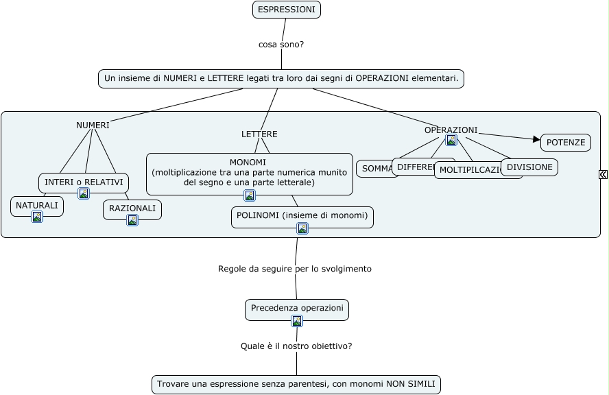 Questa Cmap, creata con IHMC CmapTools, contiene informazioni relative a: Espressioni algebriche, Un insieme di NUMERI e LETTERE legati tra loro dai segni di OPERAZIONI elementari. OPERAZIONI DIVISIONE, ESPRESSIONI cosa sono? Un insieme di NUMERI e LETTERE legati tra loro dai segni di OPERAZIONI elementari., Un insieme di NUMERI e LETTERE legati tra loro dai segni di OPERAZIONI elementari. NUMERI RAZIONALI, Un insieme di NUMERI e LETTERE legati tra loro dai segni di OPERAZIONI elementari. NUMERI INTERI o RELATIVI, Un insieme di NUMERI e LETTERE legati tra loro dai segni di OPERAZIONI elementari. OPERAZIONI POTENZE, Un insieme di NUMERI e LETTERE legati tra loro dai segni di OPERAZIONI elementari. OPERAZIONI MOLTIPILCAZIONE, Un insieme di NUMERI e LETTERE legati tra loro dai segni di OPERAZIONI elementari. OPERAZIONI DIFFERENZA, STRUMENTI Regole da seguire per lo svolgimento Precedenza operazioni, Un insieme di NUMERI e LETTERE legati tra loro dai segni di OPERAZIONI elementari. NUMERI NATURALI, Un insieme di NUMERI e LETTERE legati tra loro dai segni di OPERAZIONI elementari. LETTERE MONOMI (moltiplicazione tra una parte numerica munito del segno e una parte letterale), Precedenza operazioni Quale è il nostro obiettivo? Trovare una espressione senza parentesi, con monomi NON SIMILI, Un insieme di NUMERI e LETTERE legati tra loro dai segni di OPERAZIONI elementari. OPERAZIONI SOMMA, Un insieme di NUMERI e LETTERE legati tra loro dai segni di OPERAZIONI elementari. LETTERE POLINOMI (insieme di monomi)