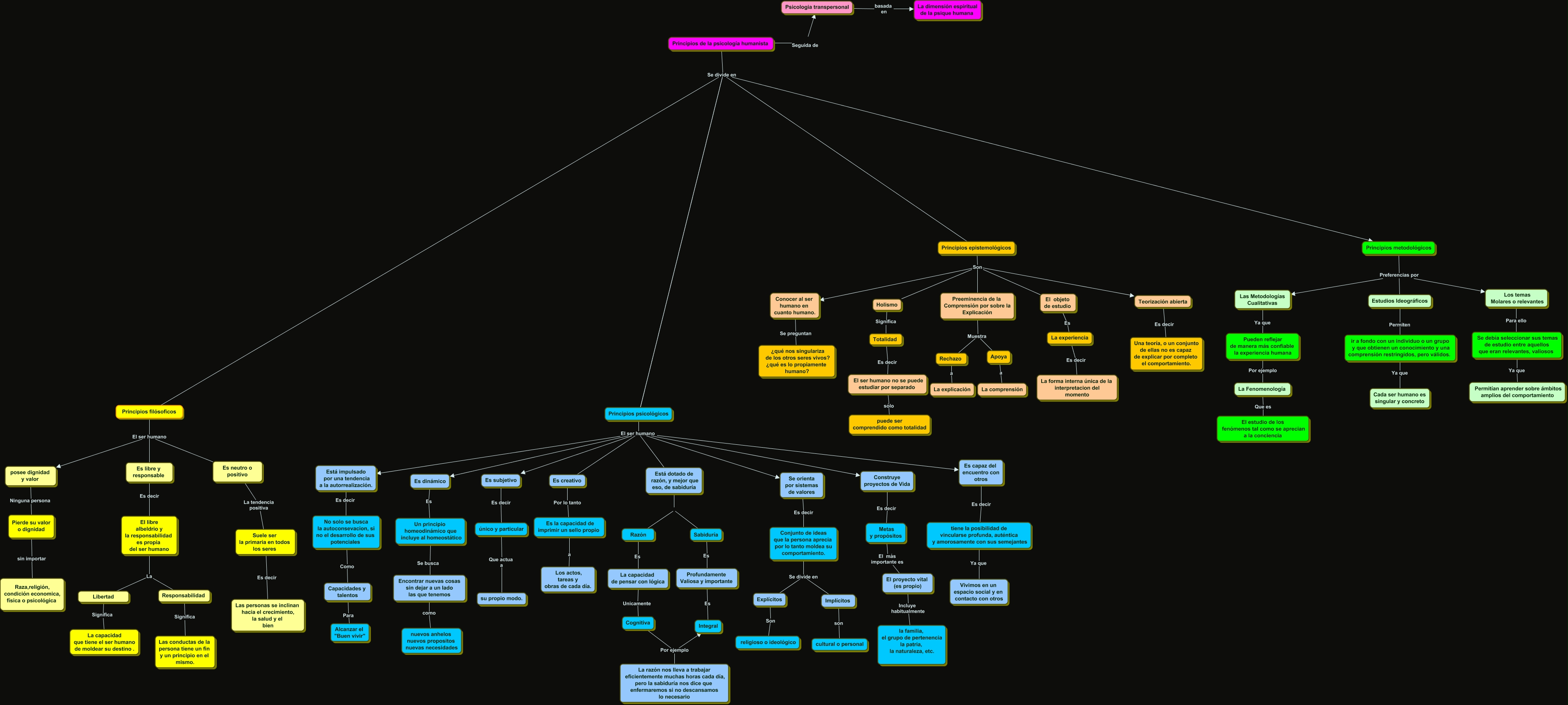 Este Cmap, tiene información relacionada con: capitulo 1, Principios psicológicos El ser humano Es subjetivo, Principios de la psicología humanista Seguida de Psicologia transpersonal, Principios de la psicología humanista Se divide en Principios psicológicos, Está dotado de razón, y mejor que eso, de sabiduría Sabiduría, Encontrar nuevas cosas sin dejar a un lado las que tenemos como nuevos anhelos nuevos propositos nuevas necesidades, Holismo Significa Totalidad, Principios epistemológicos Son Holismo, Es dinámico Es Un principio homeodinámico que incluye al homeostático, Metas y propósitos El más importante es El proyecto vital (es propio), Principios psicológicos El ser humano Es creativo, No solo se busca la autoconsevacion, si no el desarrollo de sus potenciales Como Capacidades y talentos, Principios epistemológicos Son Preeminencia de la Comprensión por sobre la Explicación, Pierde su valor o dignidad sin importar Raza,religión, condición economica, física o psicológica, Un principio homeodinámico que incluye al homeostático Se busca Encontrar nuevas cosas sin dejar a un lado las que tenemos, Pueden reflejar de manera más confiable la experiencia humana Por ejemplo La Fenomenología, Principios metodológicos Preferencias por Las Metodologías Cualitativas, Principios psicológicos El ser humano Está dotado de razón, y mejor que eso, de sabiduría, Se debía seleccionar sus temas de estudio entre aquellos que eran relevantes, valiosos Ya que Permitían aprender sobre ámbitos amplios del comportamiento, Capacidades y talentos Para Alcanzar el "Buen vivir", Principios de la psicología humanista Se divide en Principios filósoficos