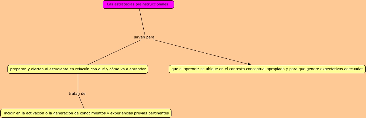 Este Cmap, tiene información relacionada con: primera, Las estrategias preinstruccionales sirven para preparan y alertan al estudiante en relación con qué y cómo va a aprender, Las estrategias preinstruccionales sirven para que el aprendiz se ubique en el contexto conceptual apropiado y para que genere expectativas adecuadas, preparan y alertan al estudiante en relación con qué y cómo va a aprender tratan de incidir en la activación o la generación de conocimientos y experiencias previas pertinentes