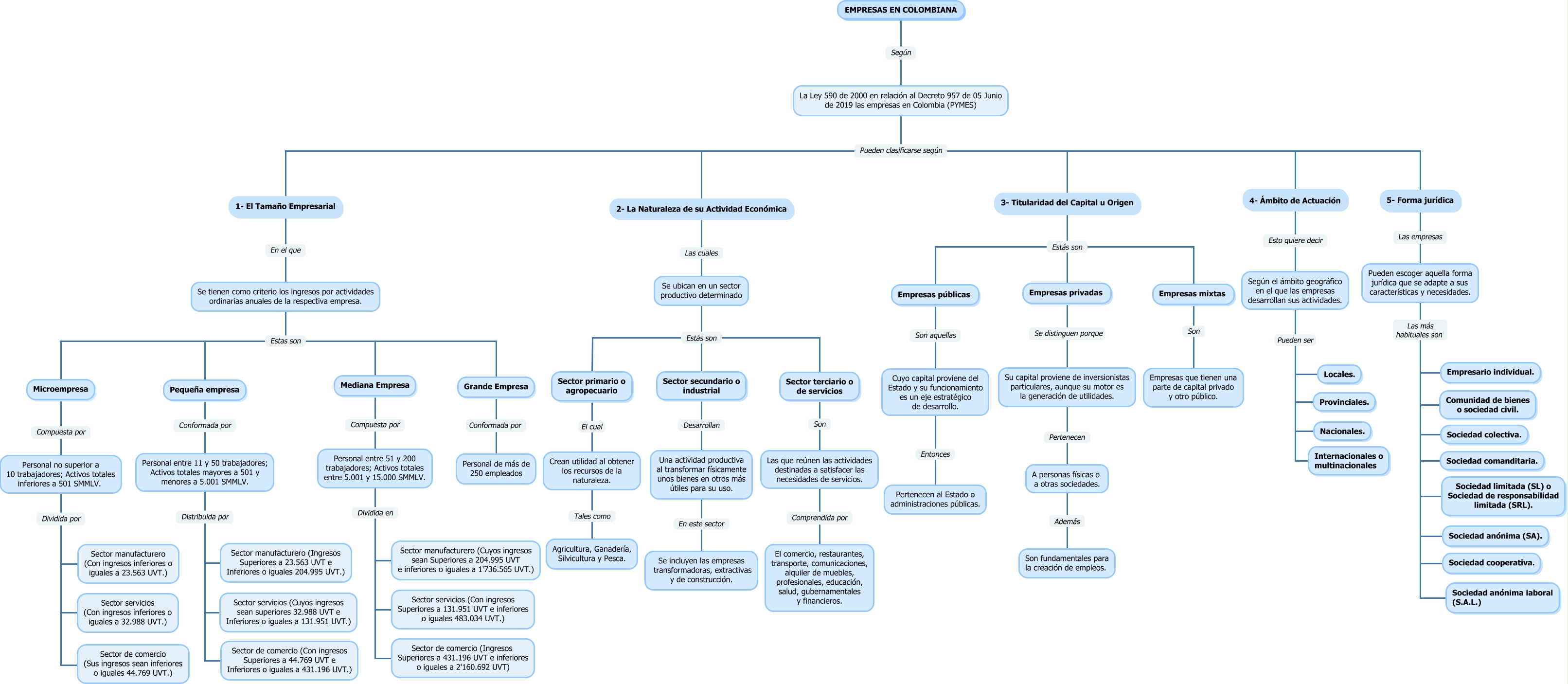 Este Cmap, tiene información relacionada con: CLASIFICACION DE LAS EMPRESAS EN COLOMBIA, Personal entre 51 y 200 trabajadores; Activos totales entre 5.001 y 15.000 SMMLV. Dividida en Sector servicios (Con ingresos Superiores a 131.951 UVT e inferiores o iguales 483.034 UVT.), Empresas públicas Son aquellas Cuyo capital proviene del Estado y su funcionamiento es un eje estratégico de desarrollo., La Ley 590 de 2000 en relación al Decreto 957 de 05 Junio de 2019 las empresas en Colombia (PYMES) Pueden clasificarse según 4- Ámbito de Actuación, La Ley 590 de 2000 en relación al Decreto 957 de 05 Junio de 2019 las empresas en Colombia (PYMES) Pueden clasificarse según 5- Forma jurídica, Pueden escoger aquella forma jurídica que se adapte a sus características y necesidades. Las más habituales son Sociedad anónima (SA)., Pueden escoger aquella forma jurídica que se adapte a sus características y necesidades. Las más habituales son Sociedad comanditaria., 5- Forma jurídica Las empresas Pueden escoger aquella forma jurídica que se adapte a sus características y necesidades., Pueden escoger aquella forma jurídica que se adapte a sus características y necesidades. Las más habituales son Sociedad limitada (SL) o Sociedad de responsabilidad limitada (SRL)., Pueden escoger aquella forma jurídica que se adapte a sus características y necesidades. Las más habituales son Sociedad anónima laboral (S.A.L.), 3- Titularidad del Capital u Origen Estás son Empresas públicas, Según el ámbito geográfico en el que las empresas desarrollan sus actividades. Pueden ser Internacionales o multinacionales, Sector secundario o industrial Desarrollan Una actividad productiva al transformar físicamente unos bienes en otros más útiles para su uso., Una actividad productiva al transformar físicamente unos bienes en otros más útiles para su uso. En este sector Se incluyen las empresas transformadoras, extractivas y de construcción., Pequeña empresa Conformada por Personal entre 11 y 50 trabajadores; Activos totales mayores a 501 y menores a 5.001 SMMLV., Empresas mixtas Son Empresas que tienen una parte de capital privado y otro público., Se tienen como criterio los ingresos por actividades ordinarias anuales de la respectiva empresa. Estas son Mediana Empresa, Mediana Empresa Compuesta por Personal entre 51 y 200 trabajadores; Activos totales entre 5.001 y 15.000 SMMLV., Según el ámbito geográfico en el que las empresas desarrollan sus actividades. Pueden ser Provinciales., Las que reúnen las actividades destinadas a satisfacer las necesidades de servicios. Comprendida por El comercio, restaurantes, transporte, comunicaciones, alquiler de muebles, profesionales, educación, salud, gubernamentales y financieros., Su capital proviene de inversionistas particulares, aunque su motor es la generación de utilidades. Pertenecen A personas físicas o a otras sociedades.