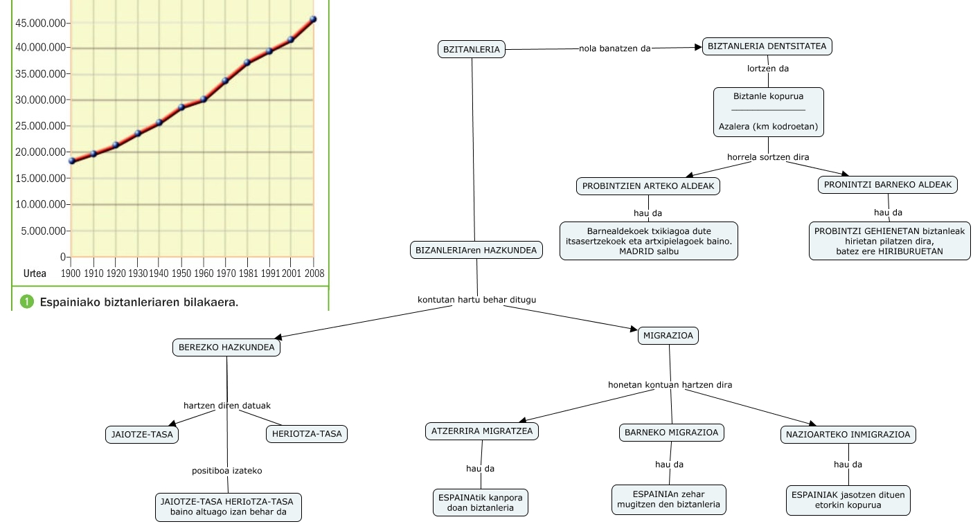 Este Cmap, tiene información relacionada con: ESPAINIAKO BIZTANLERIA eta LANA 1 (OSATUTA), BIZTANLERIA DENTSITATEA lortzen da Biztanle kopurua ______________ Azalera (km kodroetan), BZITANLERIA ???? BIZANLERIAren HAZKUNDEA, BZITANLERIA nola banatzen da BIZTANLERIA DENTSITATEA, BEREZKO HAZKUNDEA positiboa izateko JAIOTZE-TASA HERIoTZA-TASA baino altuago izan behar da, MIGRAZIOA honetan kontuan hartzen dira ATZERRIRA MIGRATZEA, BEREZKO HAZKUNDEA hartzen diren datuak JAIOTZE-TASA, BIZANLERIAren HAZKUNDEA kontutan hartu behar ditugu MIGRAZIOA, BEREZKO HAZKUNDEA hartzen diren datuak HERIOTZA-TASA, MIGRAZIOA honetan kontuan hartzen dira NAZIOARTEKO INMIGRAZIOA, NAZIOARTEKO INMIGRAZIOA hau da ESPAINIAK jasotzen dituen etorkin kopurua, PROBINTZIEN ARTEKO ALDEAK hau da Barnealdekoek txikiagoa dute itsasertzekoek eta artxipielagoek baino. MADRID salbu, PRONINTZI BARNEKO ALDEAK hau da PROBINTZI GEHIENETAN biztanleak hirietan pilatzen dira, batez ere HIRIBURUETAN, Biztanle kopurua ______________ Azalera (km kodroetan) horrela sortzen dira PROBINTZIEN ARTEKO ALDEAK, MIGRAZIOA honetan kontuan hartzen dira BARNEKO MIGRAZIOA, Biztanle kopurua ______________ Azalera (km kodroetan) horrela sortzen dira PRONINTZI BARNEKO ALDEAK, BARNEKO MIGRAZIOA hau da ESPAINIAn zehar mugitzen den biztanleria, BIZANLERIAren HAZKUNDEA kontutan hartu behar ditugu BEREZKO HAZKUNDEA, ATZERRIRA MIGRATZEA hau da ESPAINAtik kanpora doan biztanleria
